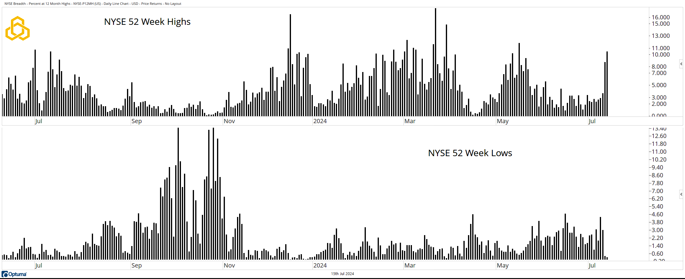 Last week saw a strong expansion in the percentage of stocks on the NYSE making new highs. At the same time, the percentage of stocks making new lows has fallen to less than 1%. In fact, there has not been a meaningful increase in new lows since 3Q2023.
