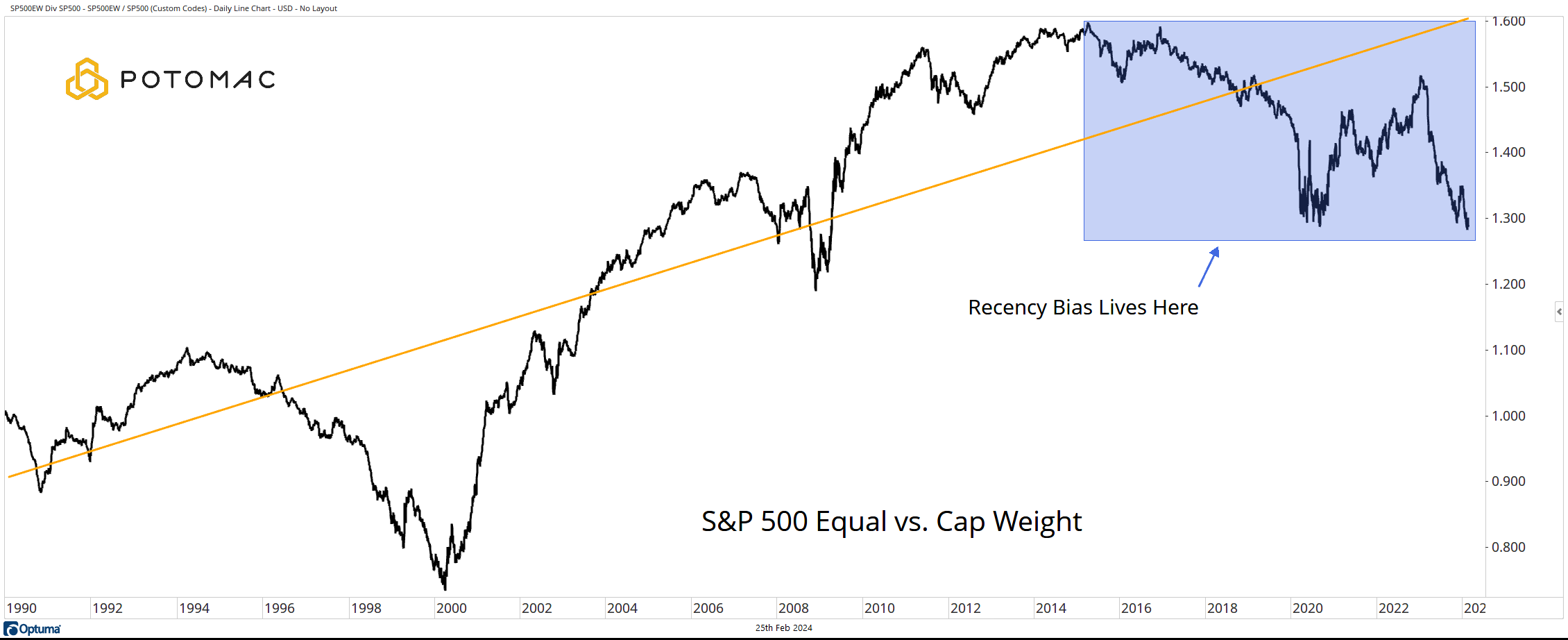 Recency bias will lead to believe otherwise, but over the long-term, the equal weight version of the S&P 500 outperforms the cap weight version. The upward-sloping linear regression line lays this out for all to see.