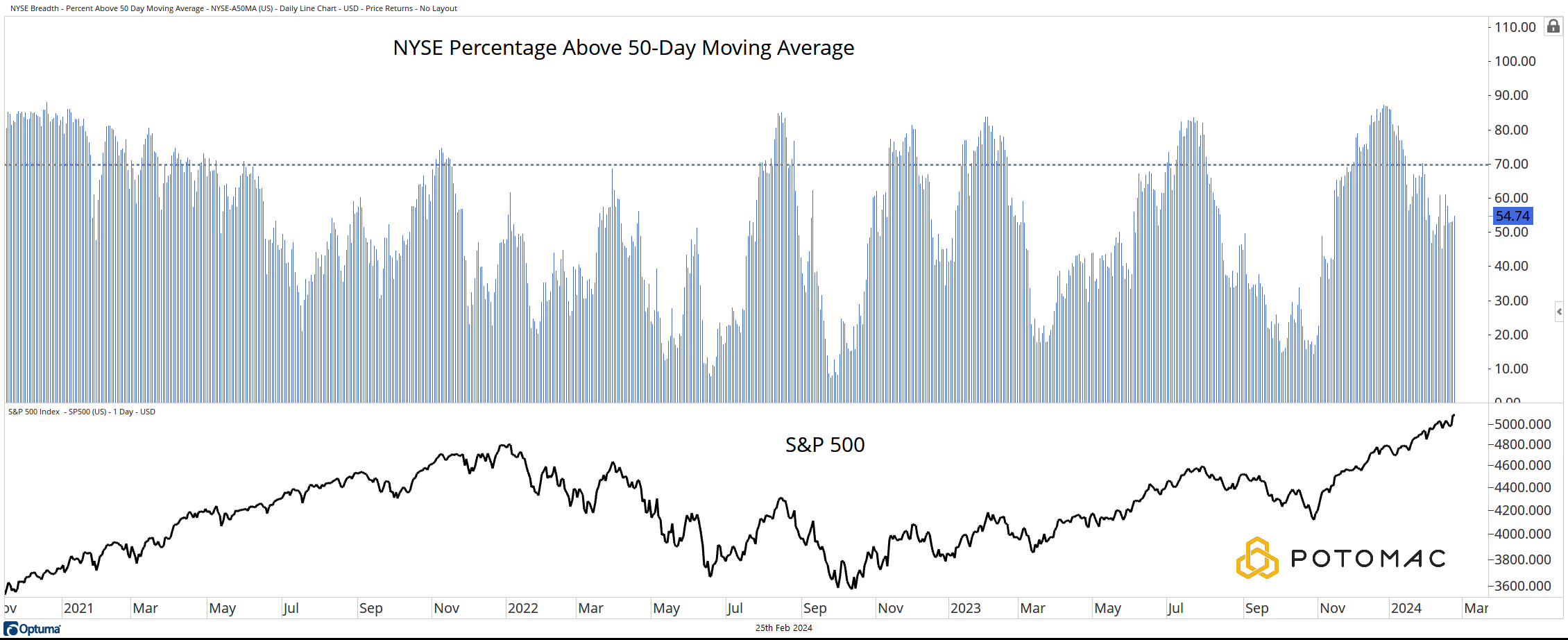 The current reading, with the S&P 500 at an all-time high, is 54.74%.