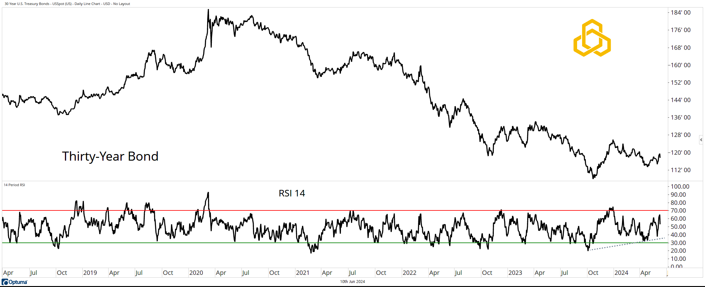 Not to be outdone by its younger siblings, the Thirty-Year Bond also appears to be losing downside momentum. The 14-day RSI has been making higher lows since last becoming oversold in October 2023.