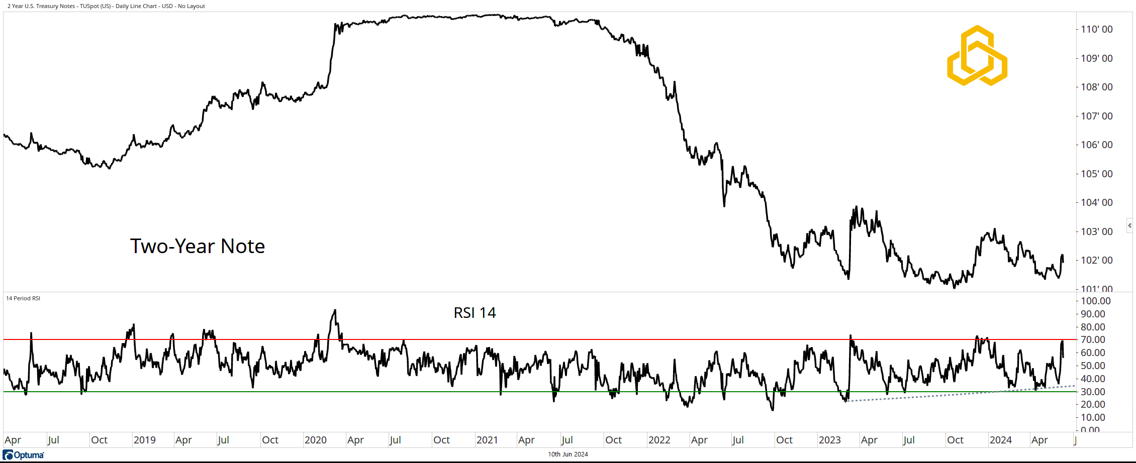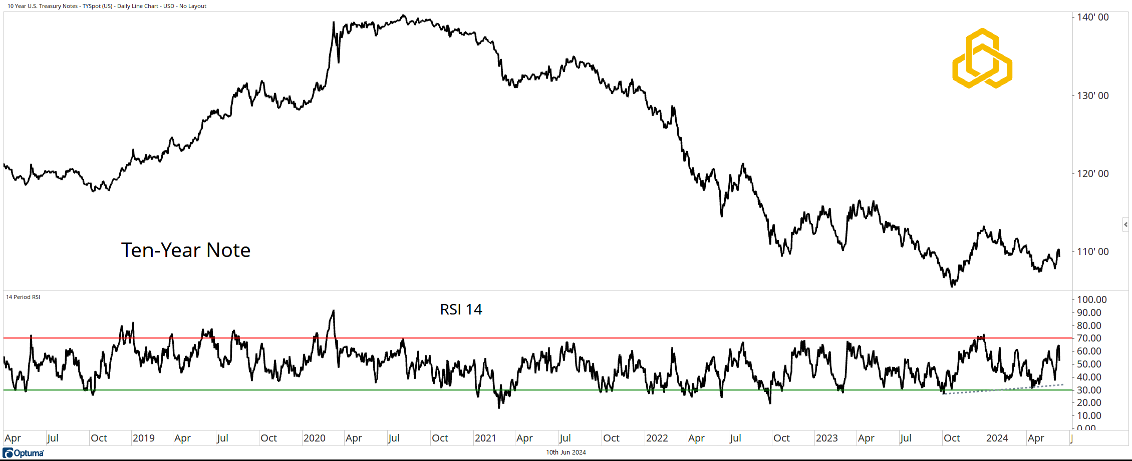 The widely watched Ten-Year Note shows similar dynamics to the Two-Year. A sharp decline has been followed by consolidation (albeit one with a downside bias). The 14-day RSI has not been oversold since October 2023.