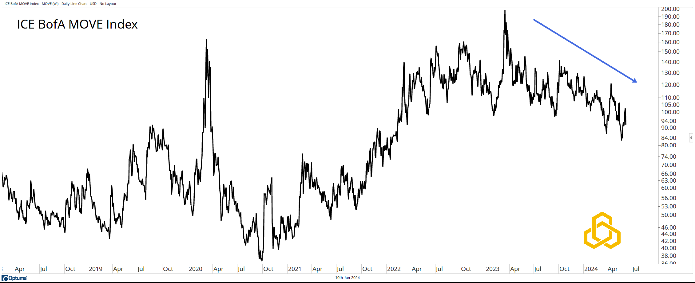 The potential bottoming (stress potential) in U.S. Treasuries plays out as volatility in the space declines. The MOVE Index (think of it as the VIX for Treasuries) has been making lower highs and lower lows since peaking in March 2023.