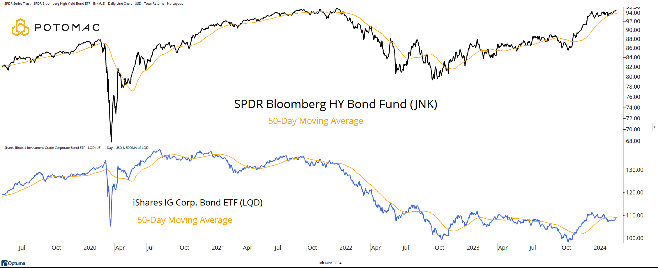 We have noted that High-Yield bonds have been strong while their Investment-Grade cousins have not. That appears to be changing. The IG bonds are in the process of regaining their 50-day moving average.