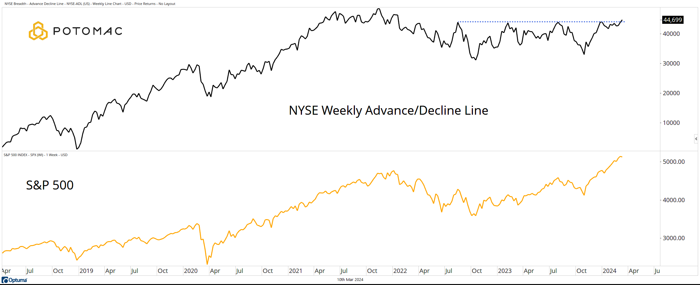 While four of the Mag 7 waver, the NYSE Advance/Decline Line is in the process of breaking from a consolidation. A divergence remains in place, but this is an incremental improvement in market breadth.