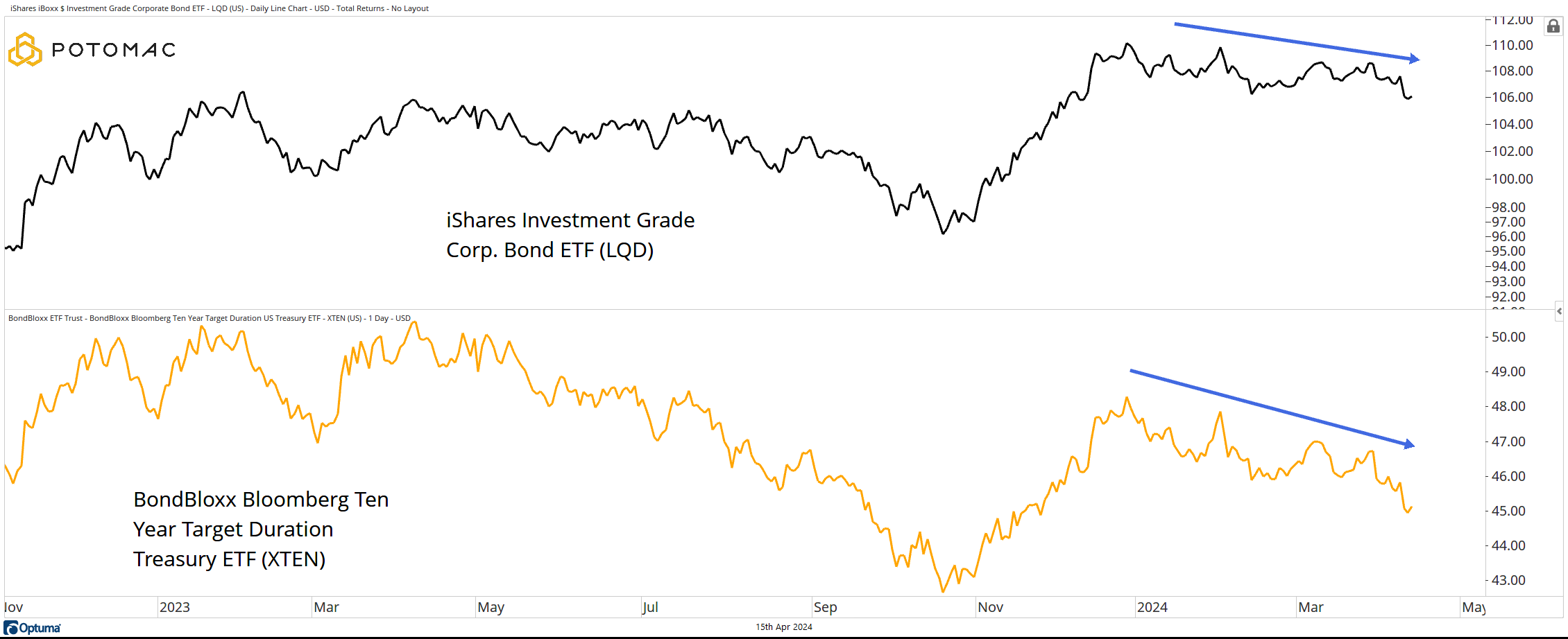 Bonds continue to diverge with equities. This theme is one that has kept out model cautious for much of 2024. Both Investment Grade Corporate and the 10-Year Treasury Bonds have been trading lower since the start of the year.