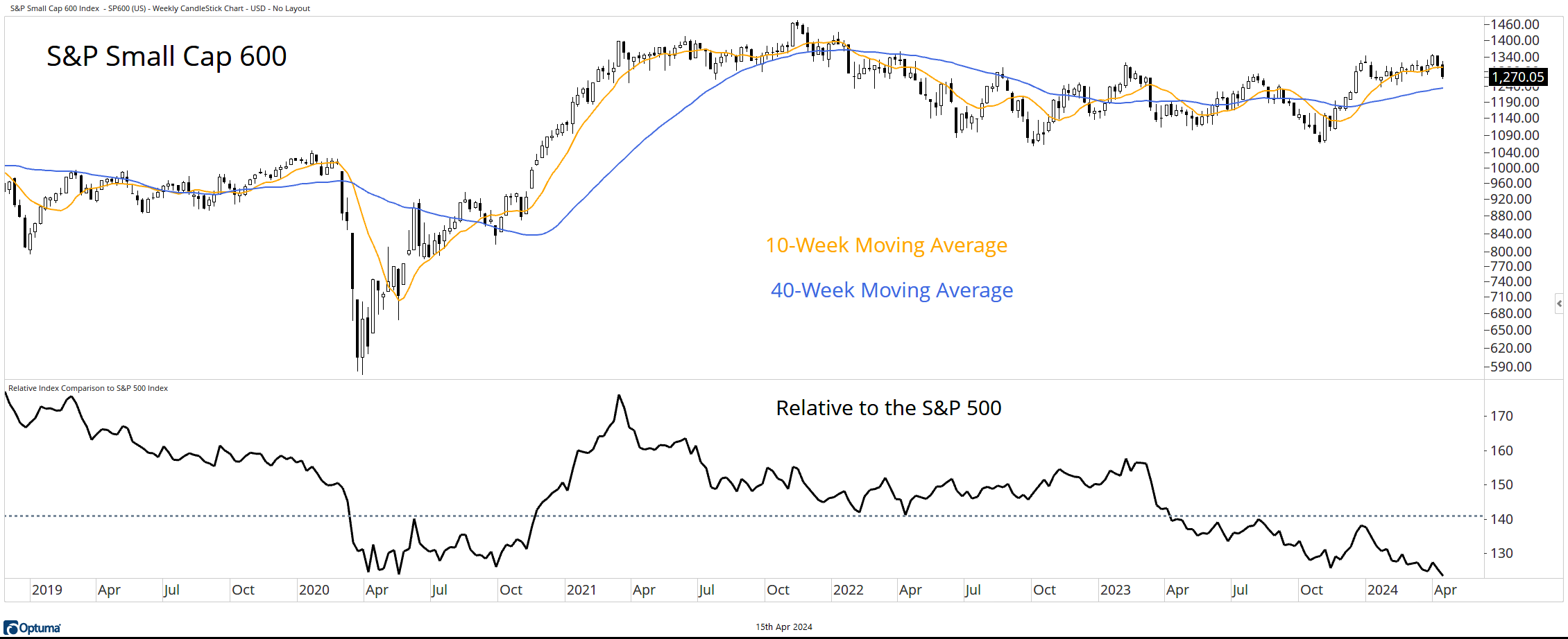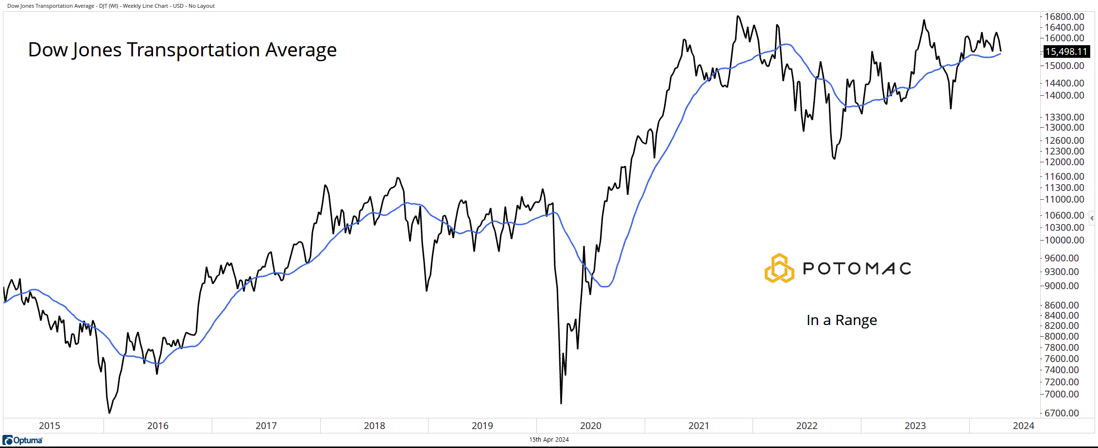 While we can’t make an outright bearish case on the transports (They are above their 27-week moving average), we can note that they have not made a new high with the S&P 500, the Dow Jones Industrial Average, or the NASDAQ 100 in 2024 (see our note from April 1st).