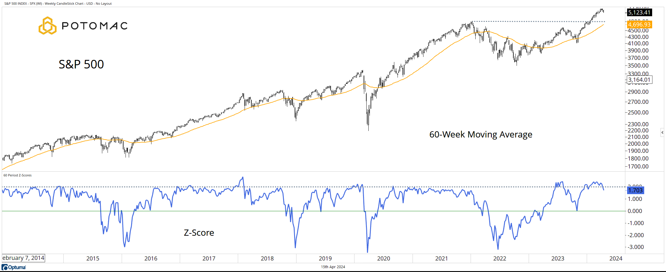 Despite back-to-back weekly declines, the S&P 500 remains near all-time highs, well above the rising 60-week moving average. In the past, we have made the case that the index was extended, trading more than two standard deviations above the 60-week moving average. Recent price weakness has alleviated that extended position, but there is room for the index to fall toward support and the moving average.
