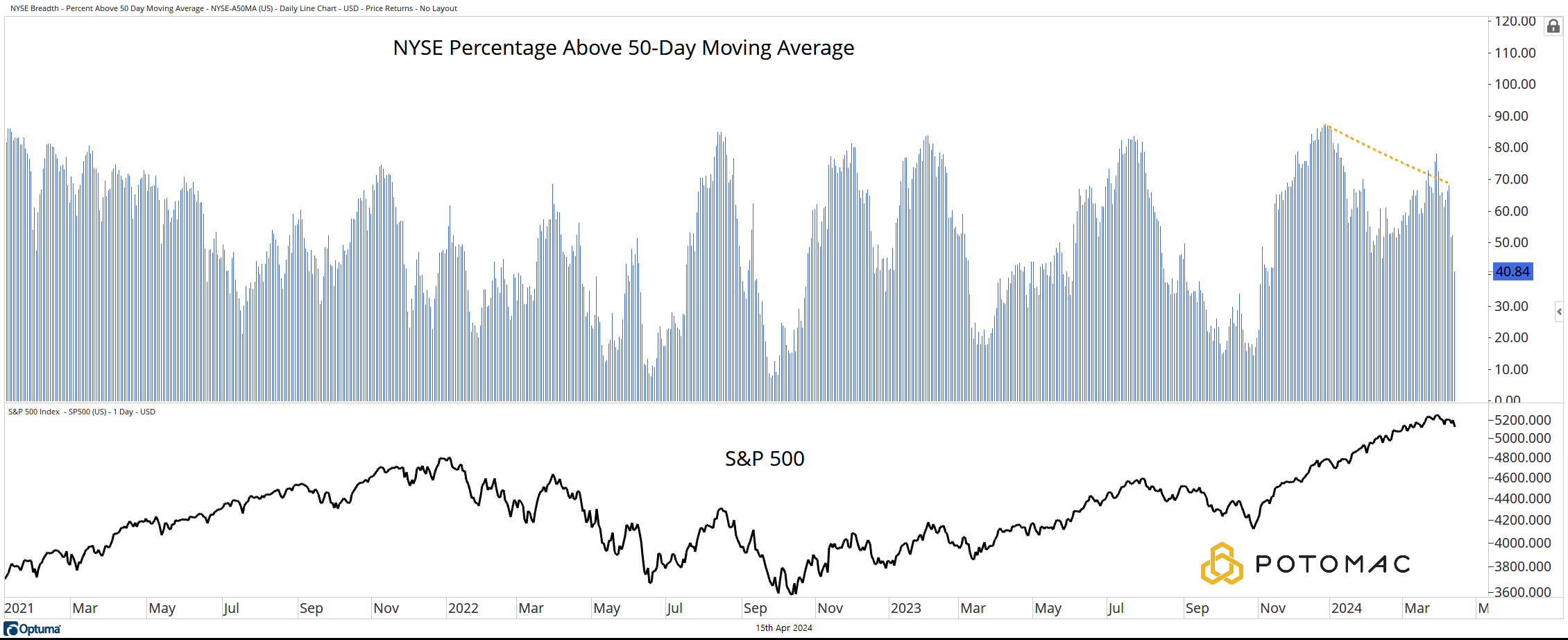 The percentage of stocks on the NYSE trading above their respective 50-day moving averages has been making a lower high since November, creating a divergence between this indicator and the S&P 500.
