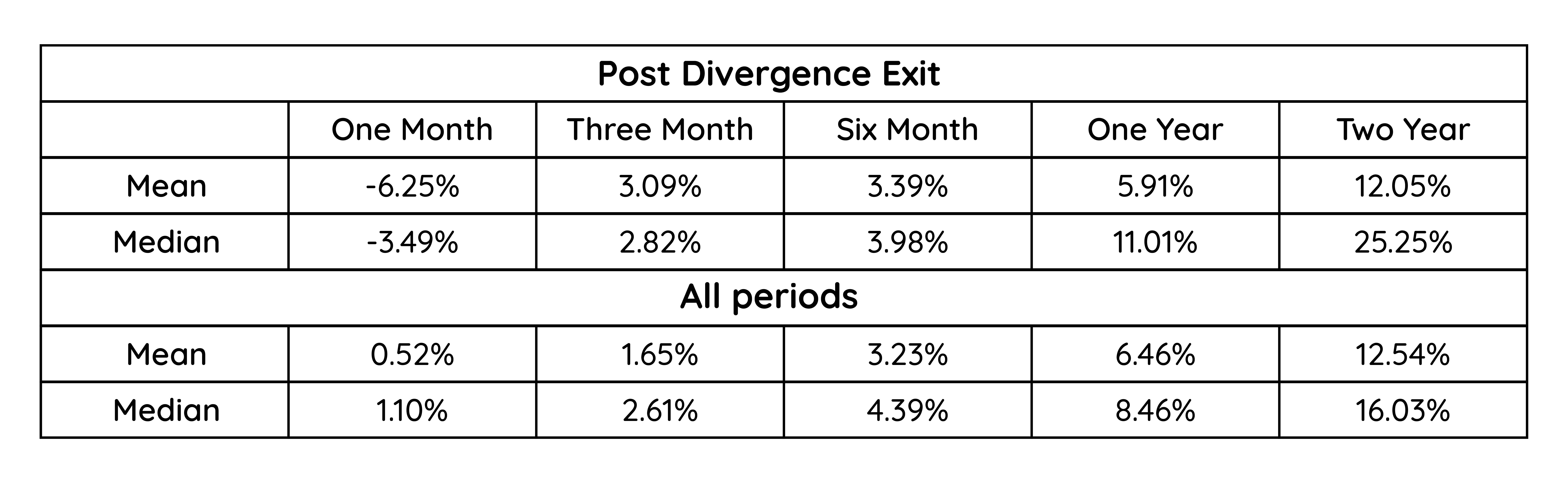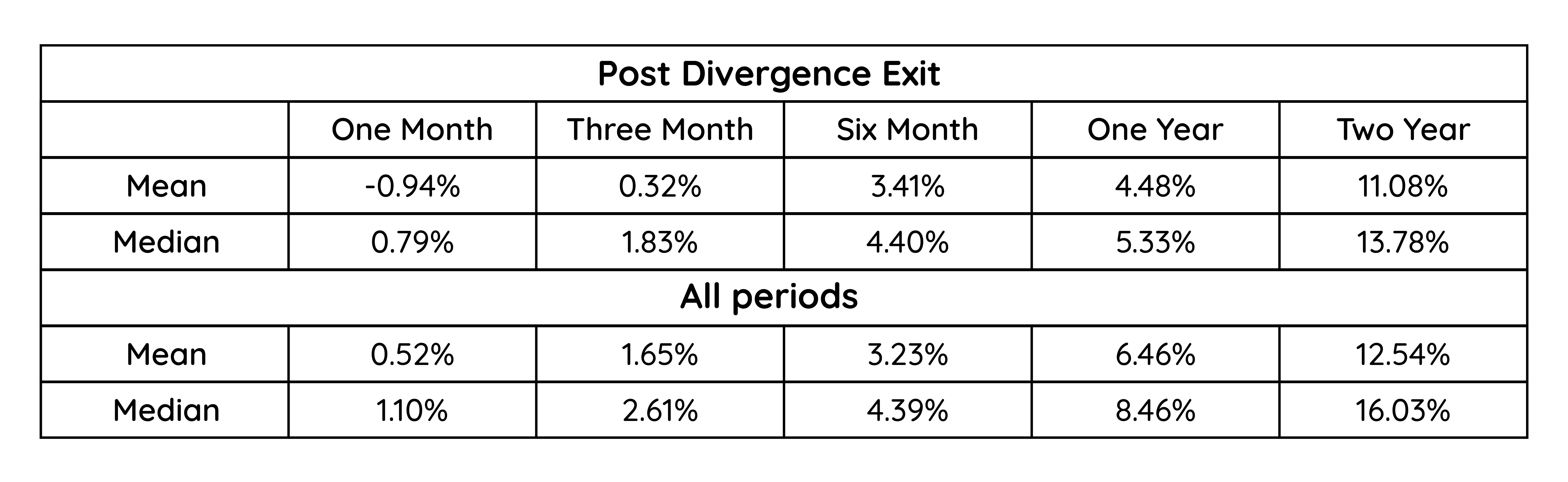For the 10% divergence example, nearly all periods were weaker than the norm going forward. For the 20% divergence, the forward one-month average and mean returns were negative. Time periods beyond that were a mixed result.