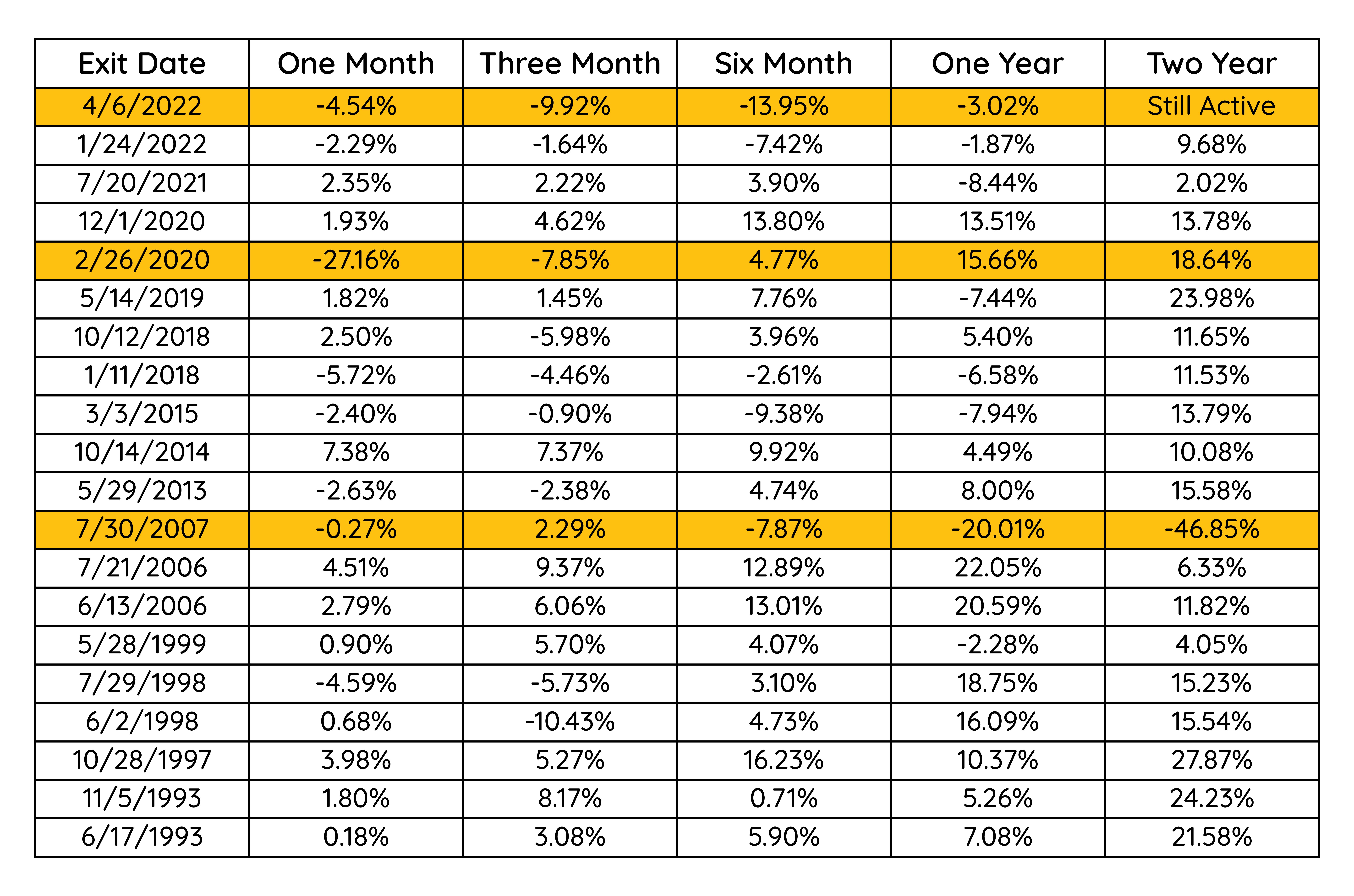 These are the exit dates with forward returns in the same format as shown before with a couple of well-timed exits highlighted. All exits followed a divergence of greater than 5%.