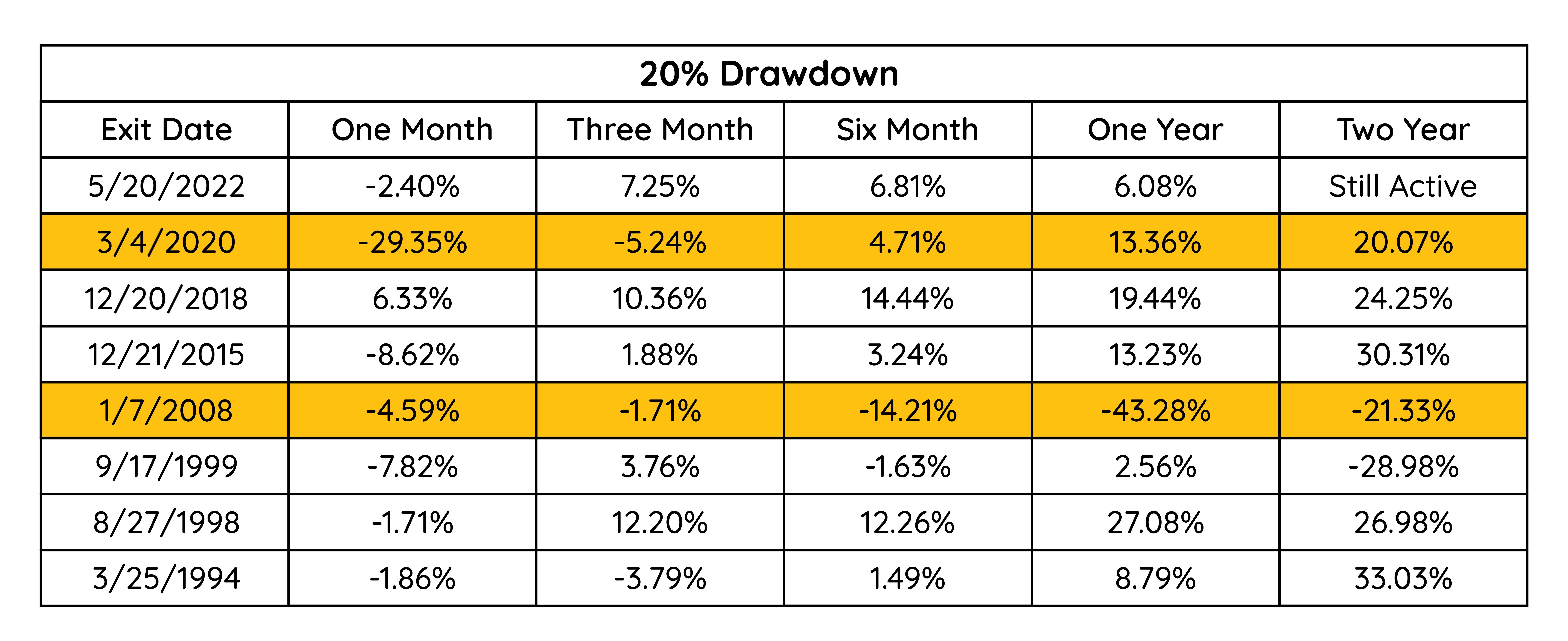 Below are the exit dates since 1990 along with the forward returns of the Industrials for differing time periods. Highlighted are some of the largest future drawdowns: