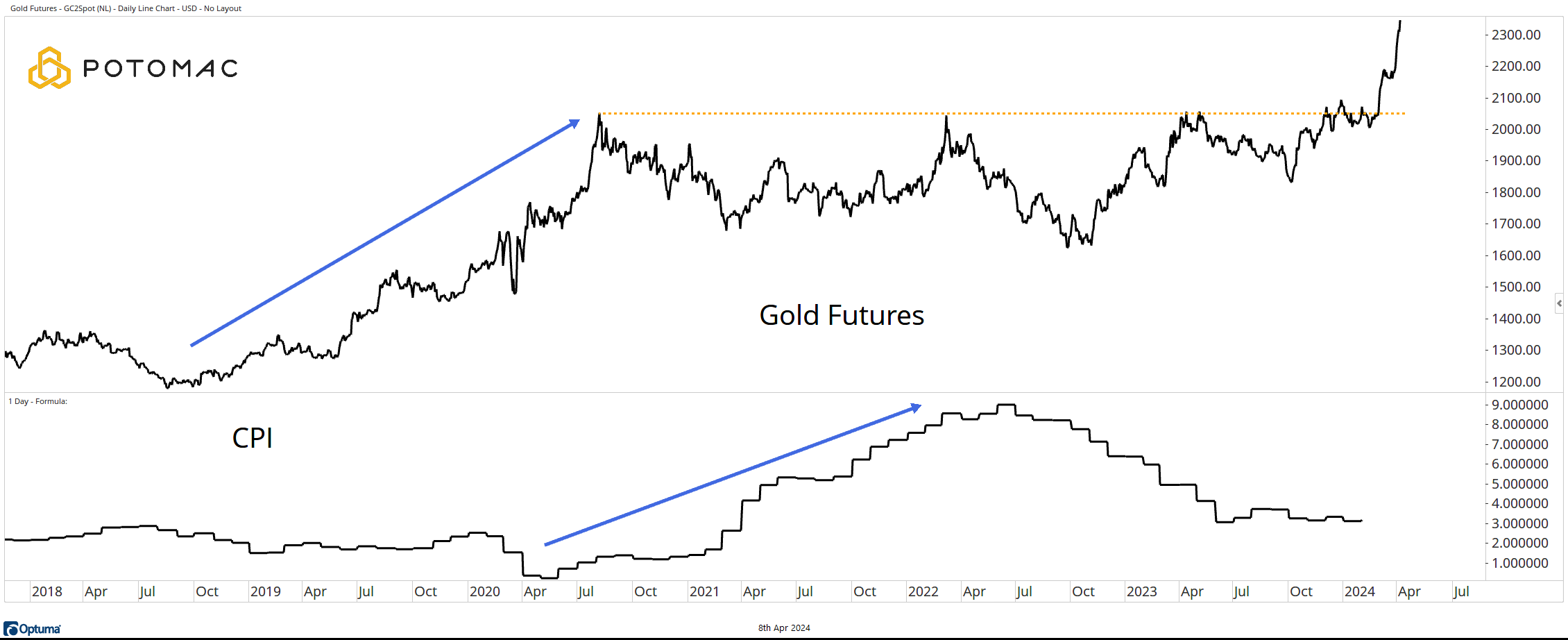 This chart is a repeat from our March 18th note. Then we highlighted that Gold tends to turn higher ahead of inflation (CPI). Today we note that Gold is accelerating to the upside after breaking to new highs.