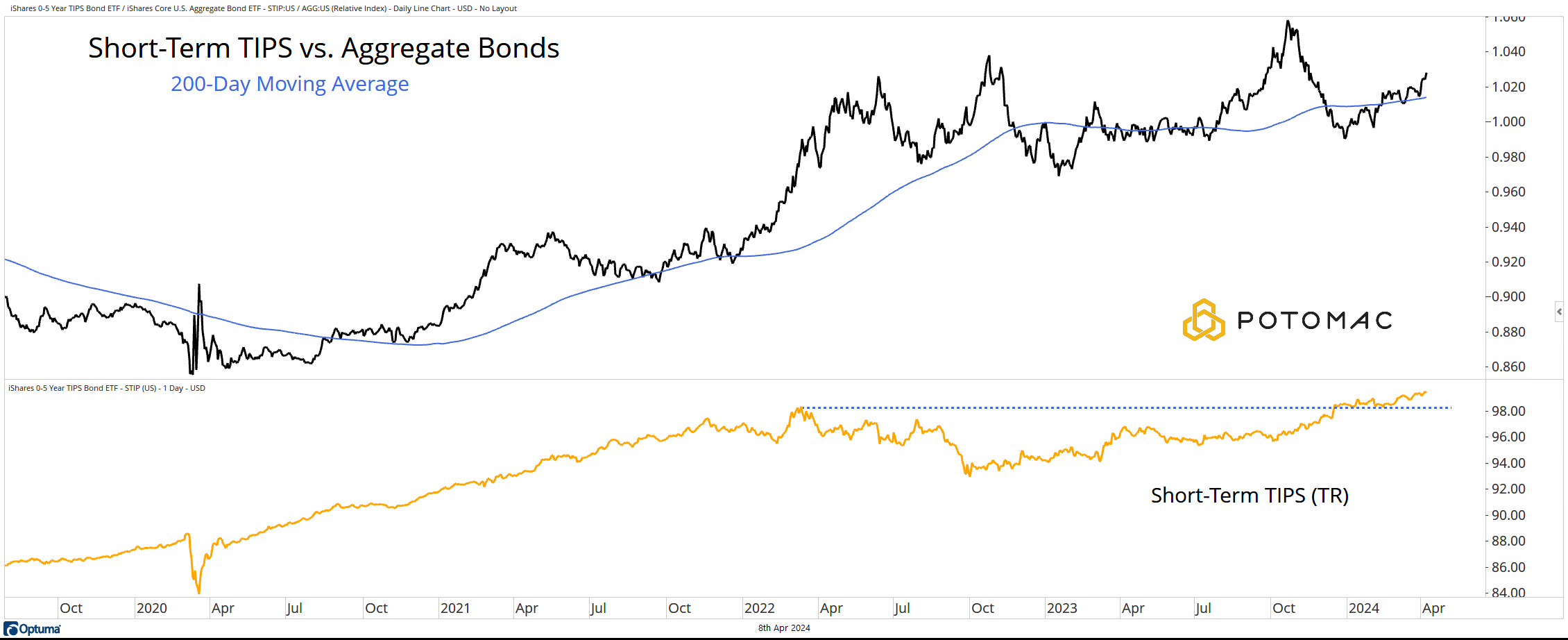 The total return ratio of short-term TIPS (STIP) relative to aggregate bonds (AGG) has been moving higher since the start of the year and has recently accelerated above the rising 200-day moving average. At the same time, STIP is trading at new highs on a total return basis.