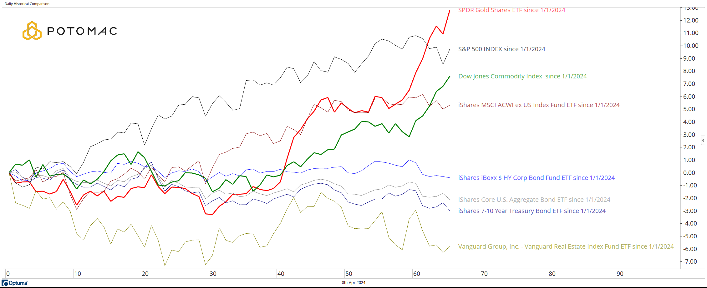 Since the start of 2024, Gold has been the best-performing asset followed by the S&P 500. While gold has certainly received a lot of attention of late, we note that the Dow Jones Commodity Index is in the number three slot year to date. Fixed Income and Real Estate are lagging.