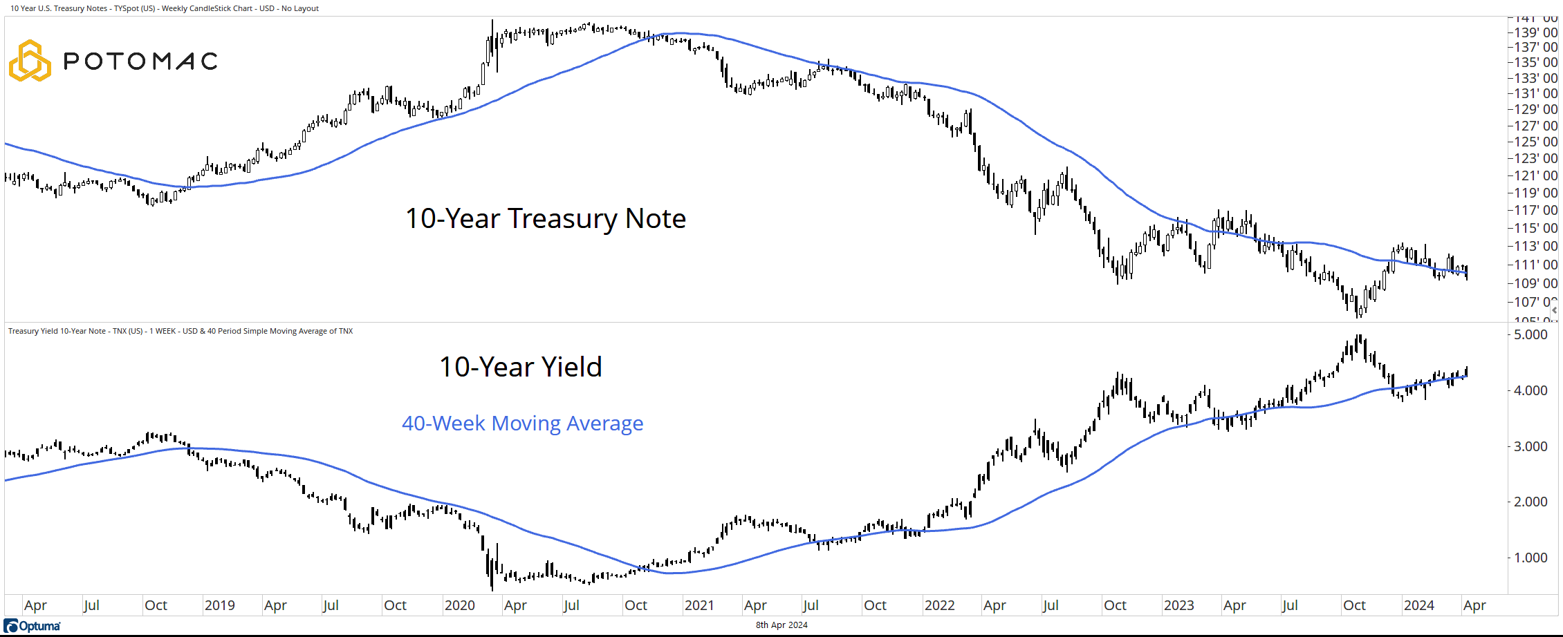 The trend of the 10-Year Note price is still lower. The notes have been hovering around the 40-week moving average, but that average is declining. As one would expect, the trend of the 10-Year Yield is the opposite.