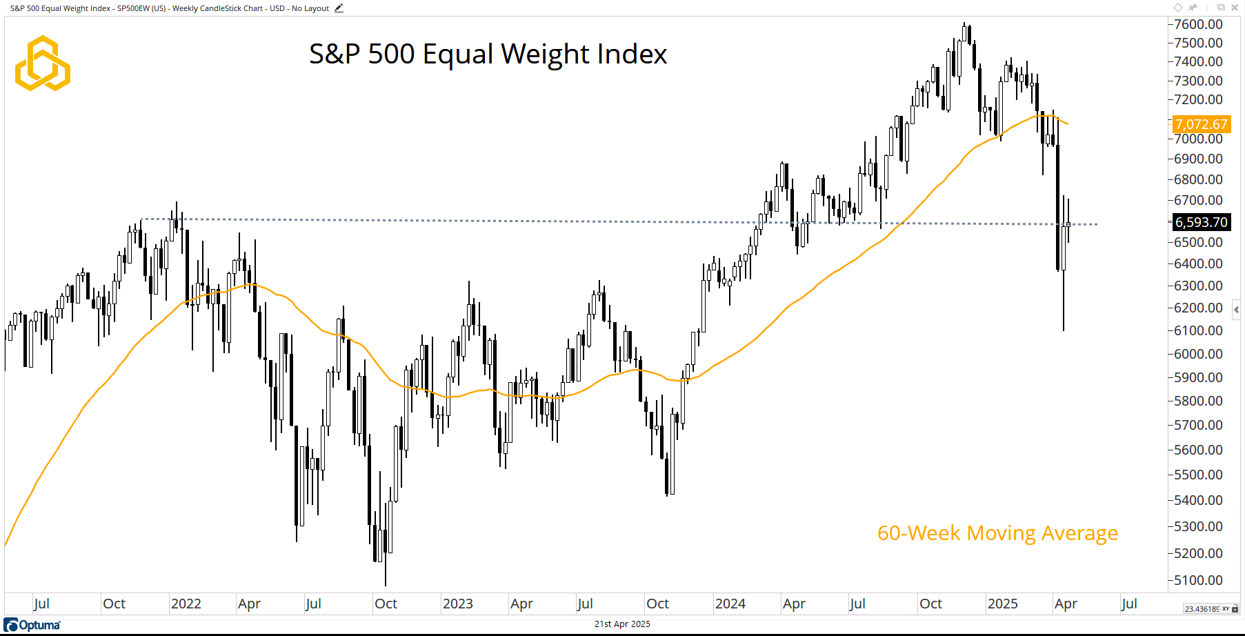 While the S&P 500 closed lower for the week, the equal-weight version of the index managed to close higher for a second consecutive week. Yes, it remains below a declining 60-week moving average, but the average stock appears to be trying to gain a foothold near prior cycle highs.