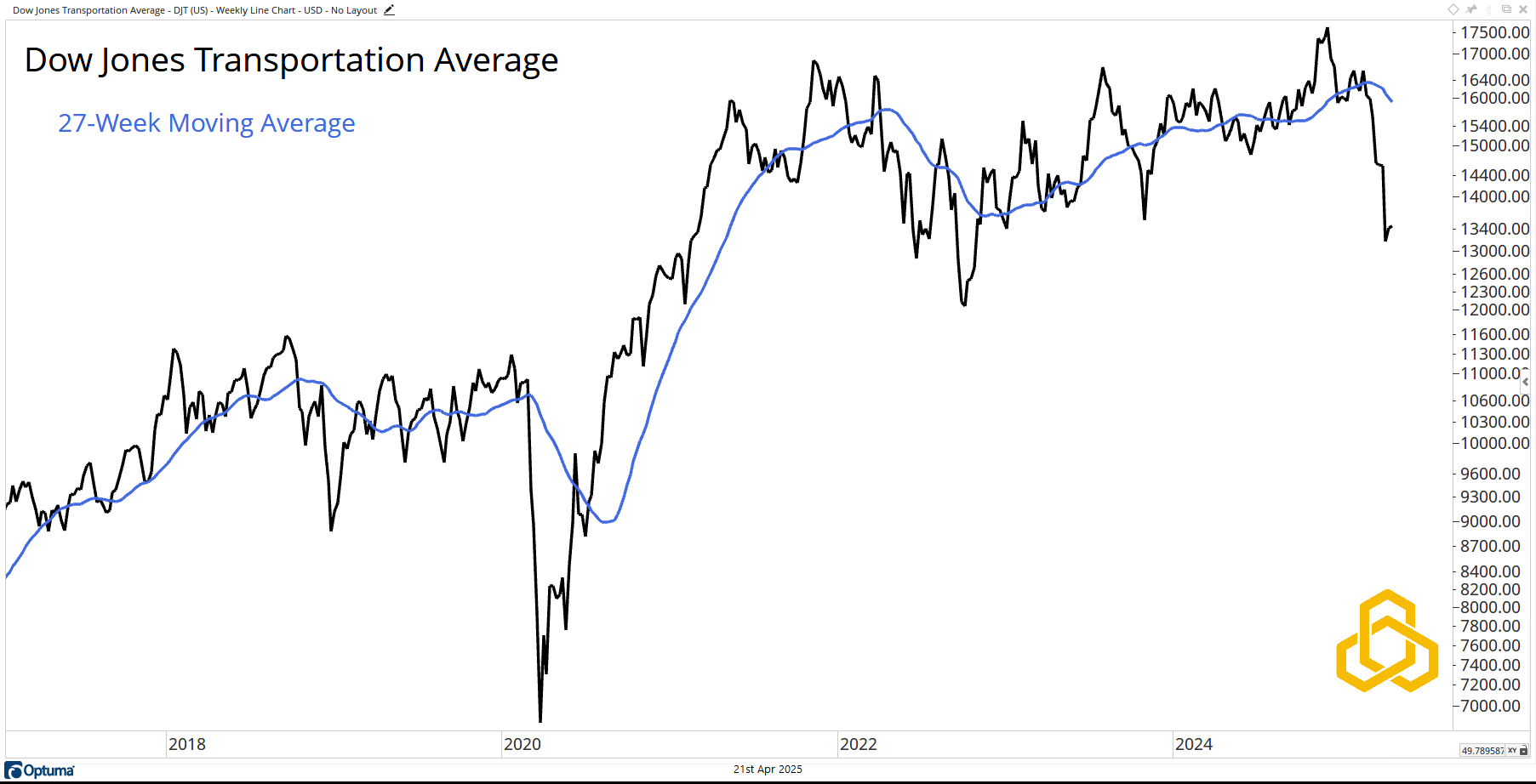 The transports remain well below the declining 27-week moving average. Until that changes, it is hard to become overly bullish.