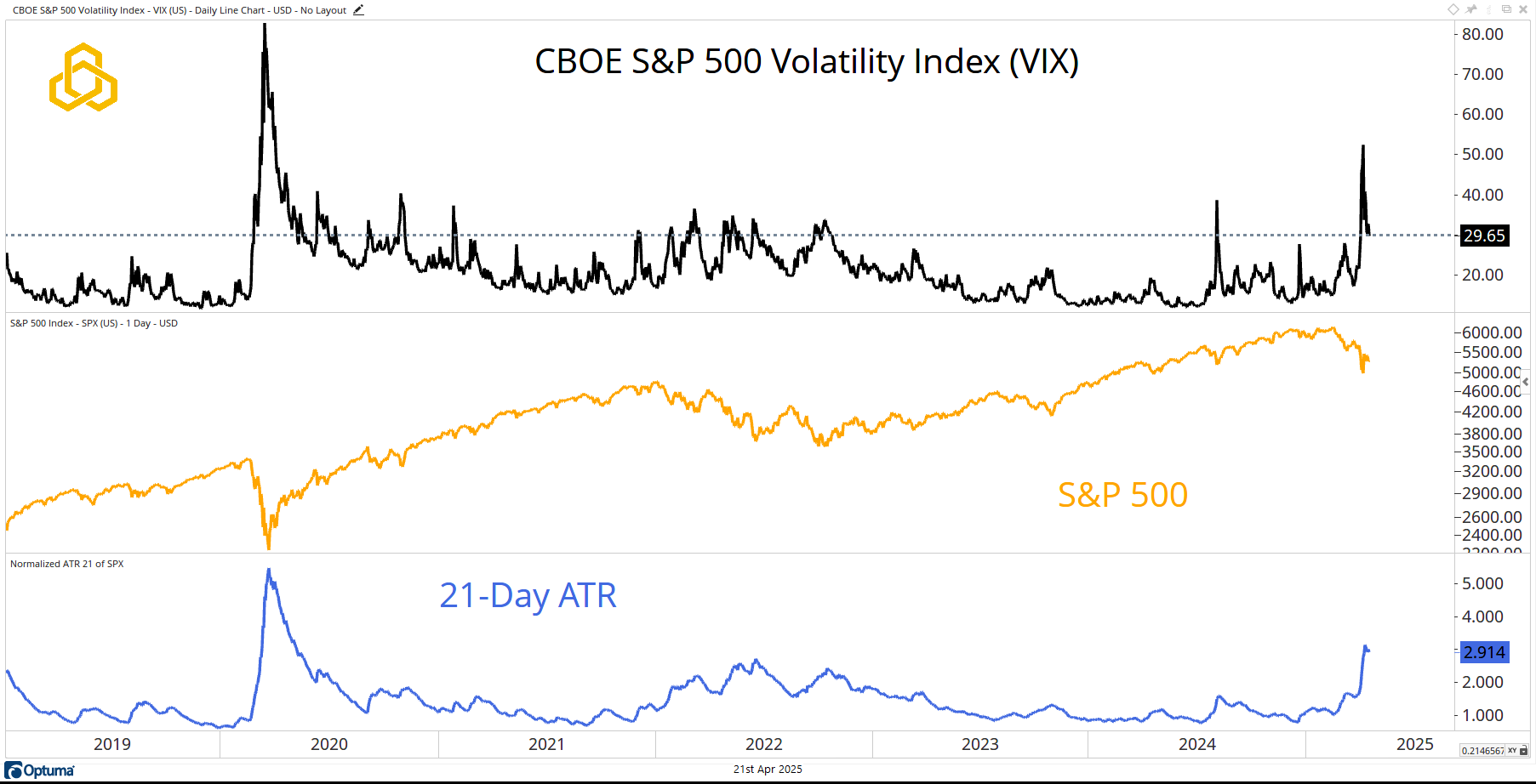 While most people focus on the VIX, which measures implied volatility, few talk about the Average True Range (ATR), a proxy for realized volatility. The current VIX (29.65 reference) implies that the S&P 500 will move approximately 1.85% per day over the next month. However, the 21-day ATR (2.914% reference) shows that the S&P 500 has been moving nearly 3% per day over the past month.