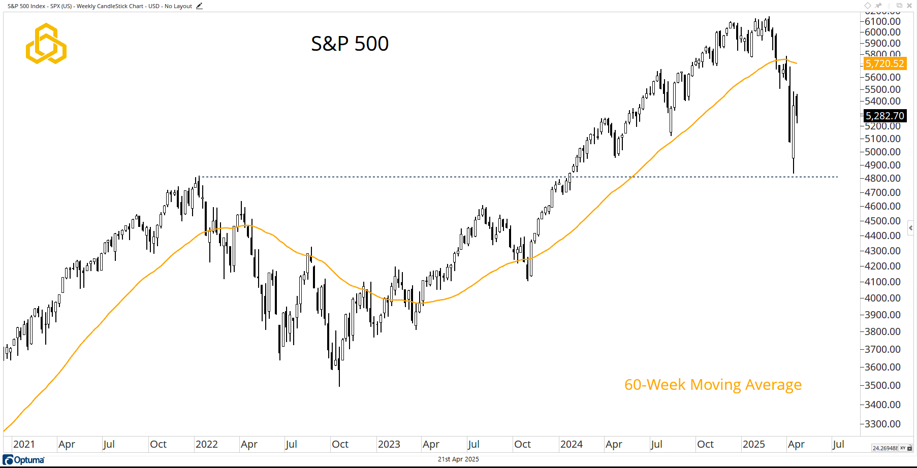 The S&P 500 closed lower during the holiday-shortened trading week and remains below a declining 60-week moving average. Stabilization that allows the moving average to “catch down” to price would be the slower path to forming a bottom. A strong rally from here that recaptures the moving average would resemble the “V-bottom” we’ve all become accustomed to.