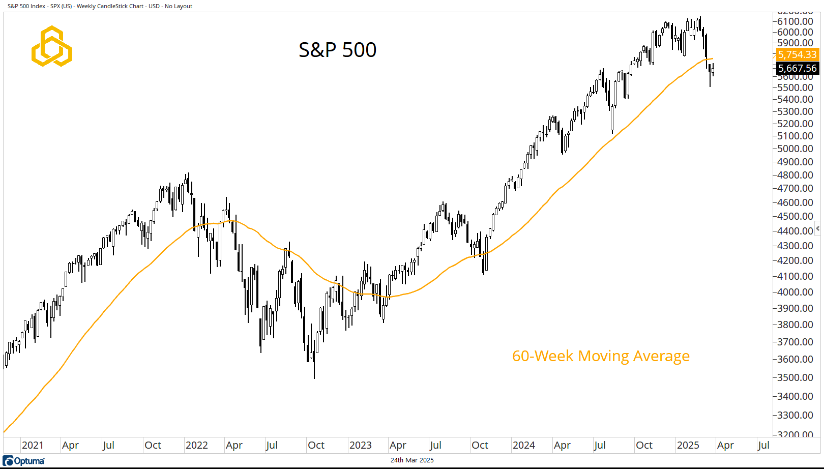 Many in the bullish camp have argued that there is not a major cause for concern here because it is only the MAG 7 that is pulling the market lower. Yes, the MAG 7 has been hit hard—no one is debating that. But, at the same time, the S&P 500 EW has a structure that is very similar to that of the S&P 500. It sits below the 60-week moving average, which is beginning to shift from rising to flat.