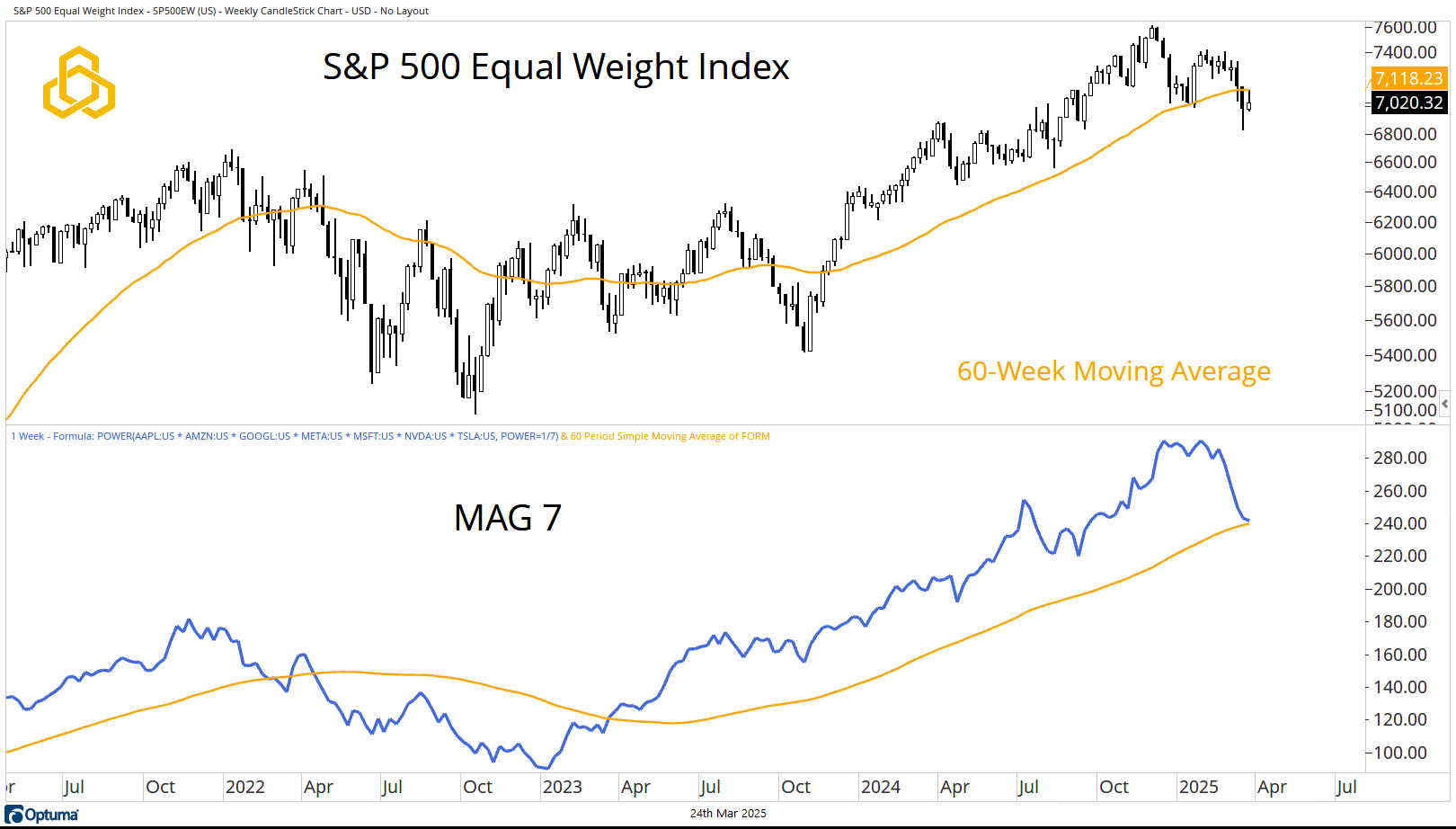 Meanwhile, Equal Weight MAG 7 is holding above the still-rising 60-week moving average.