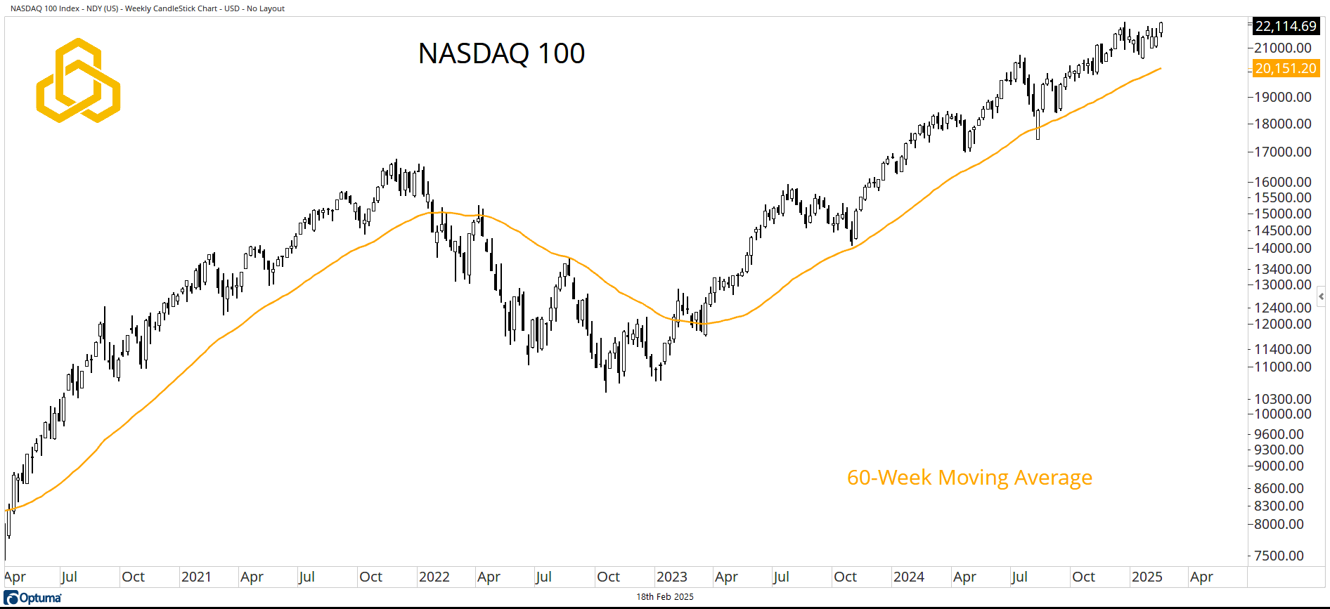 Turning now to the market that draws a lot of attention because it houses many of the large growth stocks—the NASDAQ 100. Here too, we see new weekly all-time closing highs. Here too, we see those highs playing out above a steadily rising 60-week moving average.