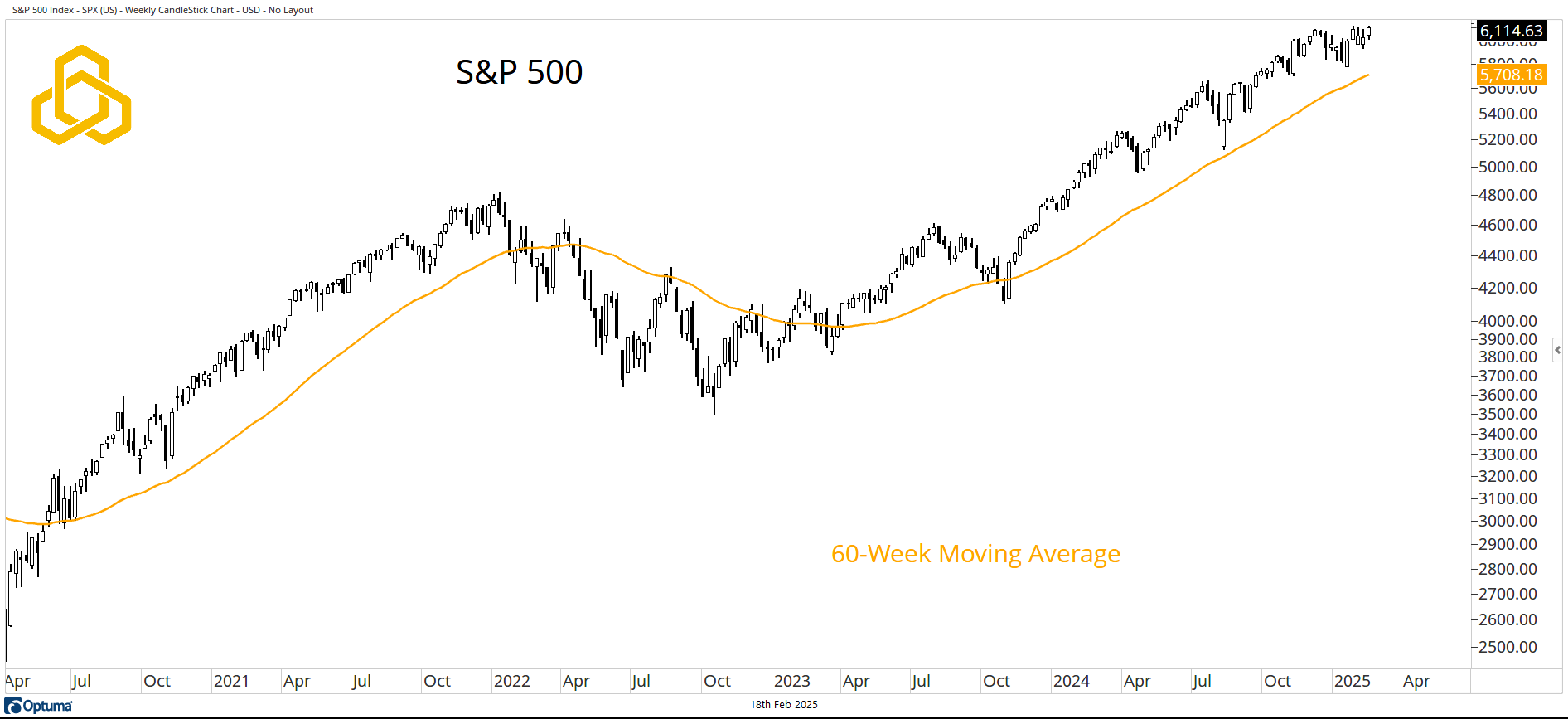 Starting, as we always do, with the S&P 500, we can see the weekly all-time high last week. At all-time highs, the index is, by definition, above the 60-week moving average. That average continues to steadily rise.