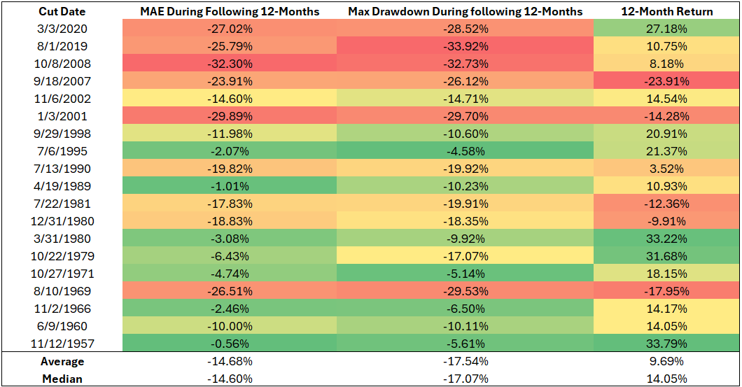 At Potomac, we dislike the types of analysis that simply look at an event and tell you how an asset performed over the next X-number of months—usually 12, so we will stick with that. We dislike it because it's incomplete. There is rarely any mention of what the journey is like. What does the investor have to endure to arrive at that outcome 12 months later? The table below highlights key metrics for the S&P 500 Index following the first cut of the cycle.
