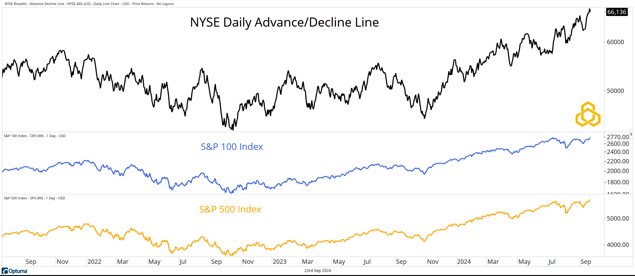 For now, the equity market has one focus: new highs. Both the S&P 500 and the S&P 100 are trading at record levels. The bullish trends are confirmed by breadth, as the NYSE Advance/Decline Line is also at record highs.