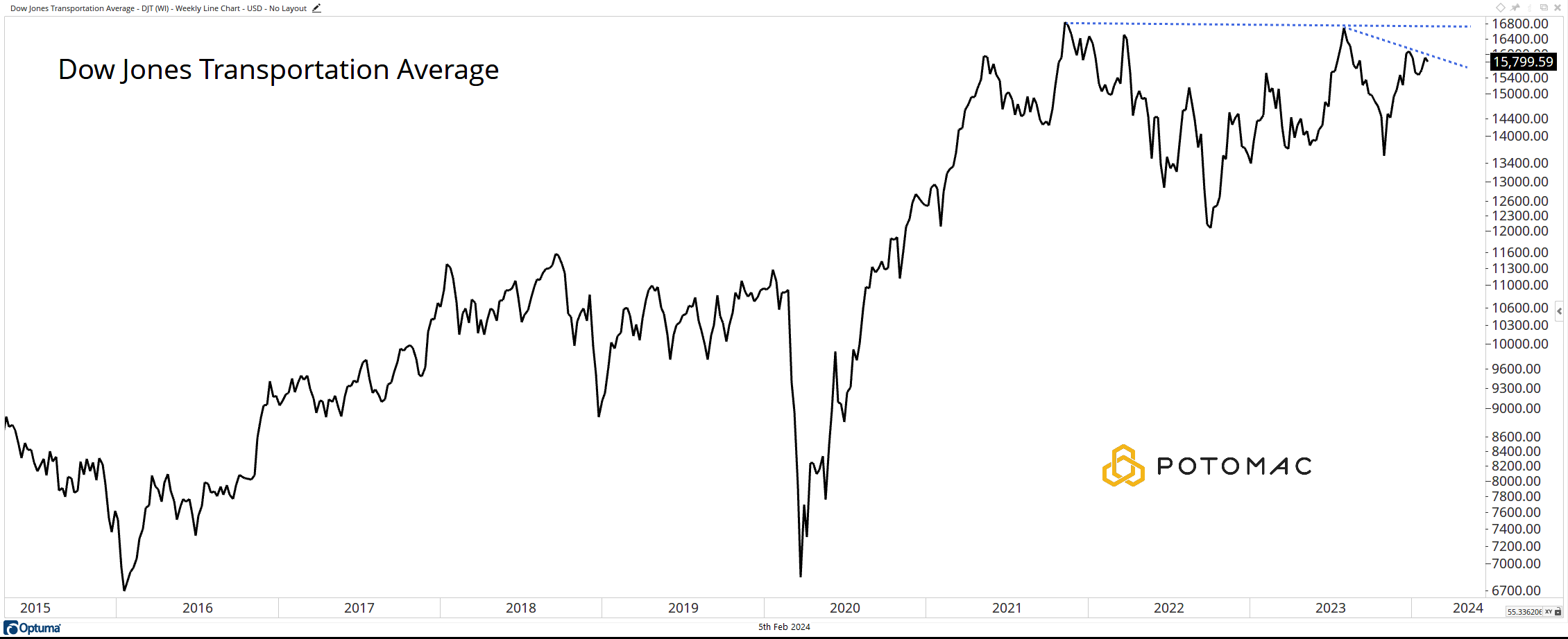 This is one that has been in place for a long time and is admittedly important to our process at Potomac. As the broader equity market makes new highs, the Transports have not.