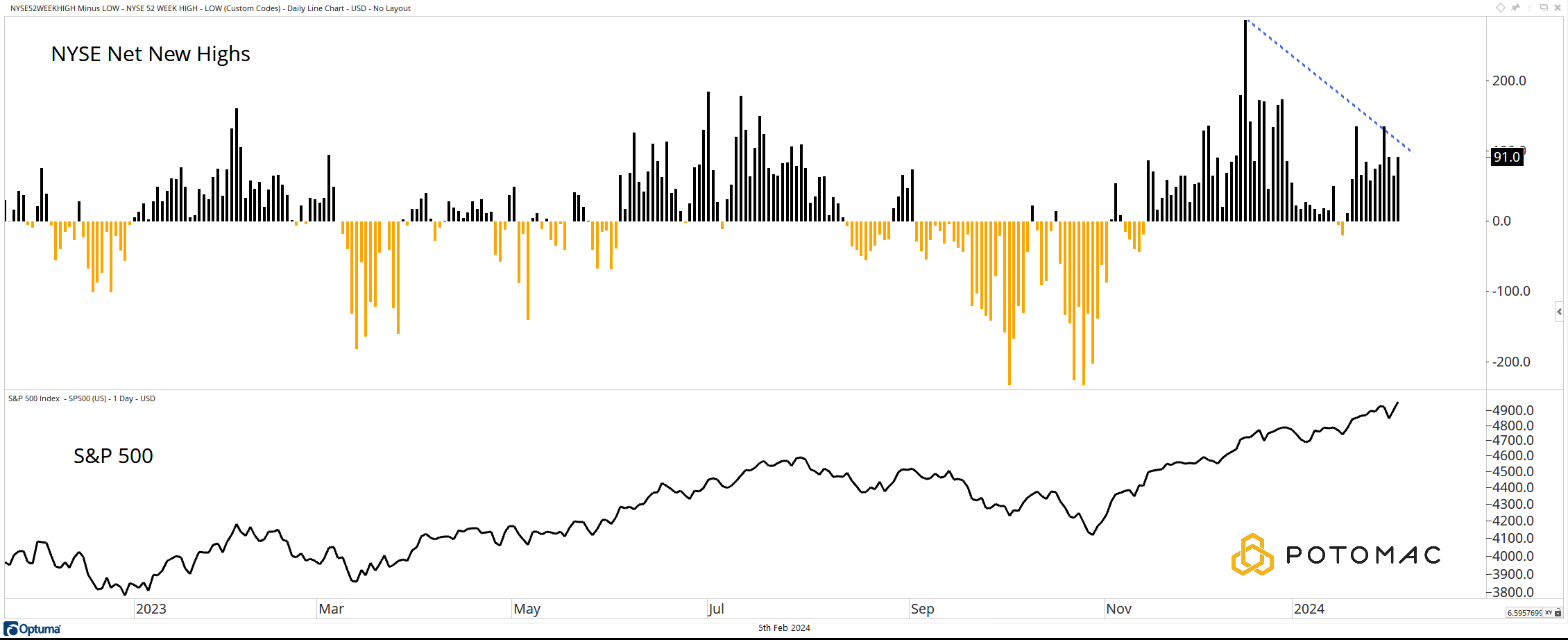 In a strong bull market, we want to see more stocks making new 52-week highs than making 52-week lows. Thus far, 2024 has not delivered the goods in this department.