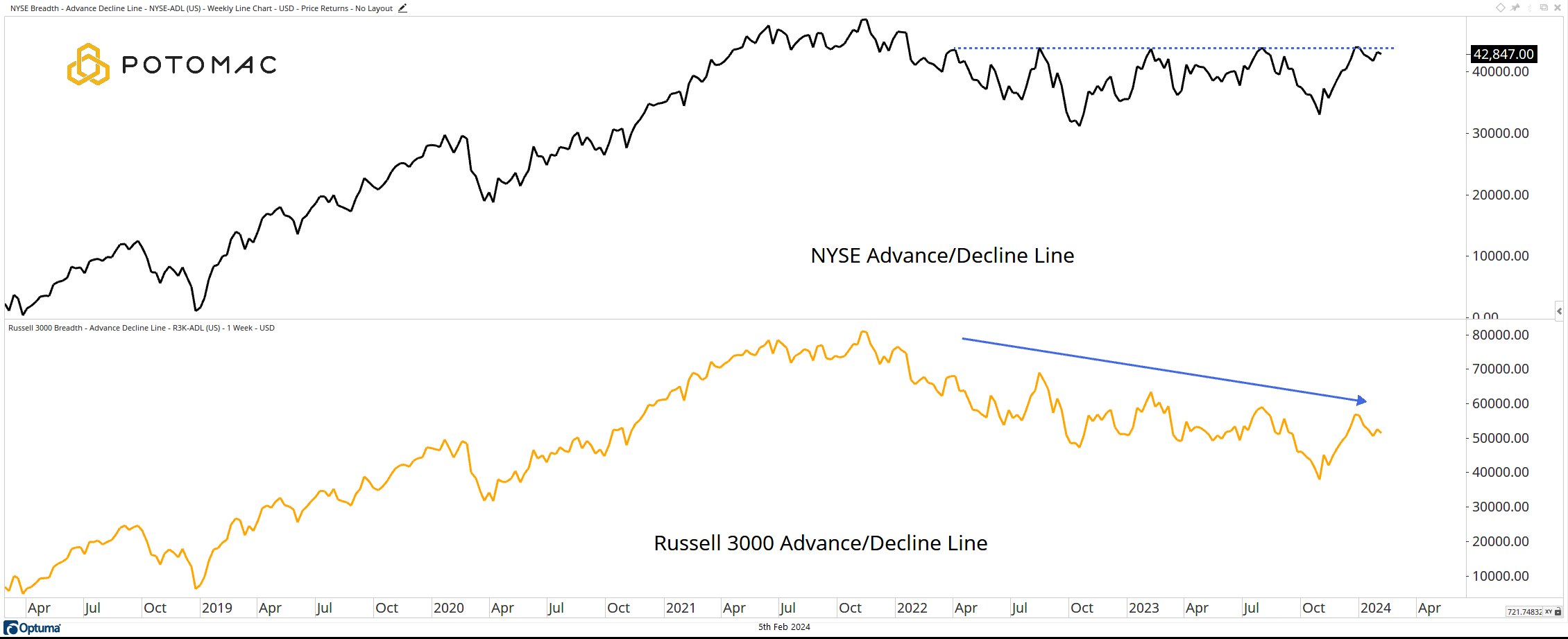 The divergence in the A/D Line of the Russell 3000 is even more pronounced.