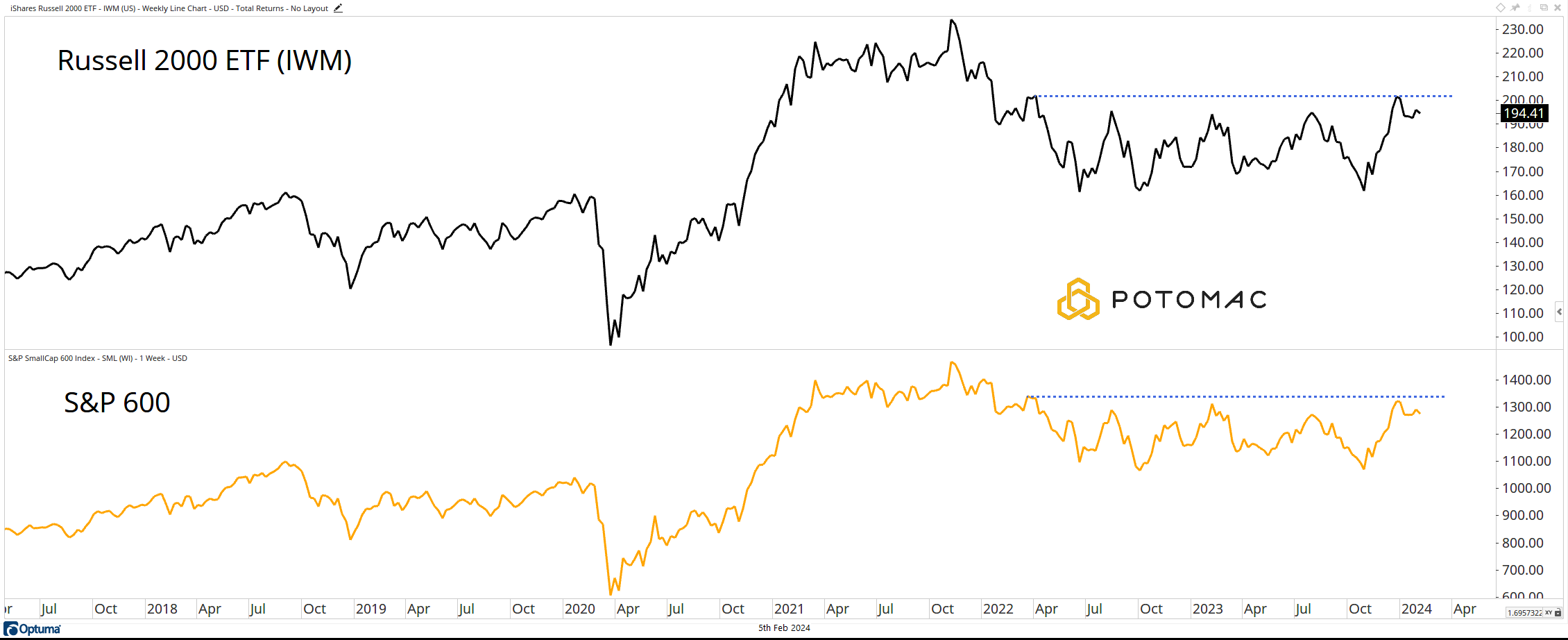 The Russell 2000 has been stuck in a trading range since April 2022. Admittedly, this index holds a lot of low-quality stocks. Perhaps it is unfair to compare them to the biggest and best in the U.S.