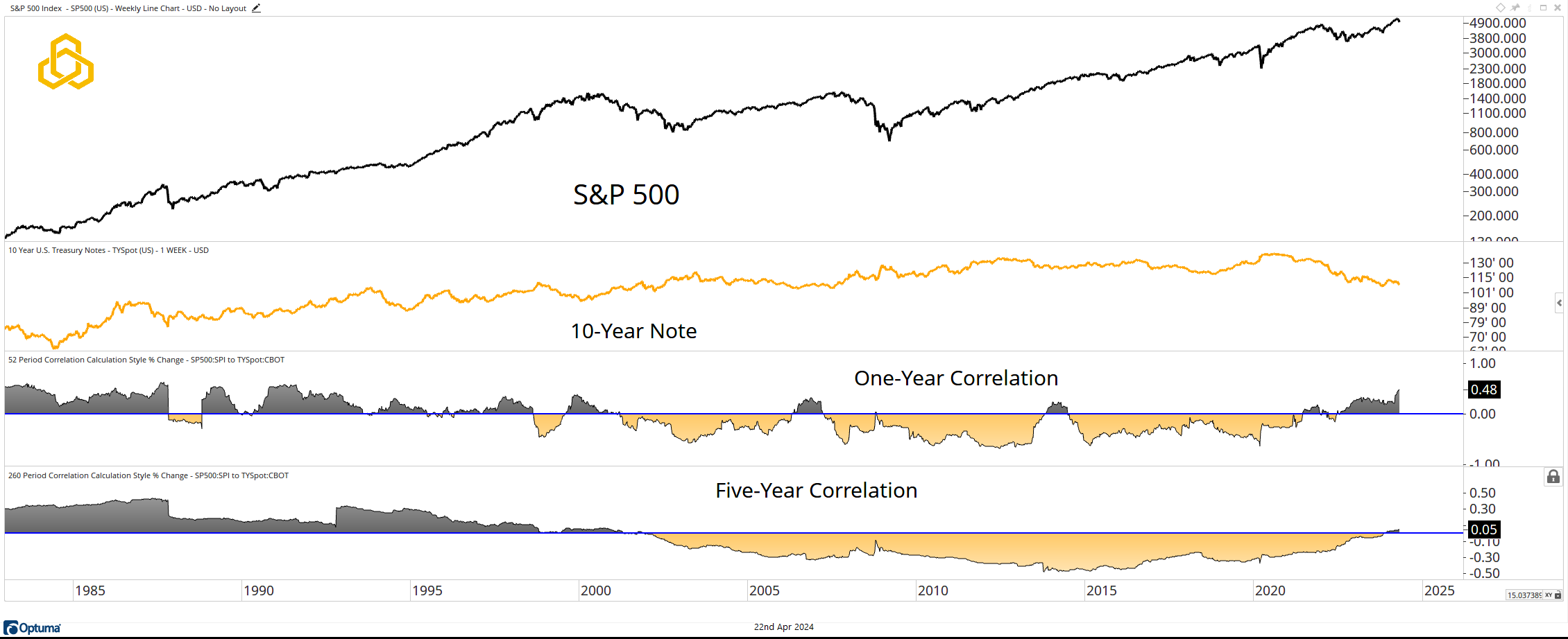 Last week saw the S&P 500 and the NASDAQ Composite Index log 6-day losing streaks for the first time since October 2022, a short-term change in market character. At the same time, stock/bond correlation continues to move further into positive territory on the one-year and five-year timeframes.
