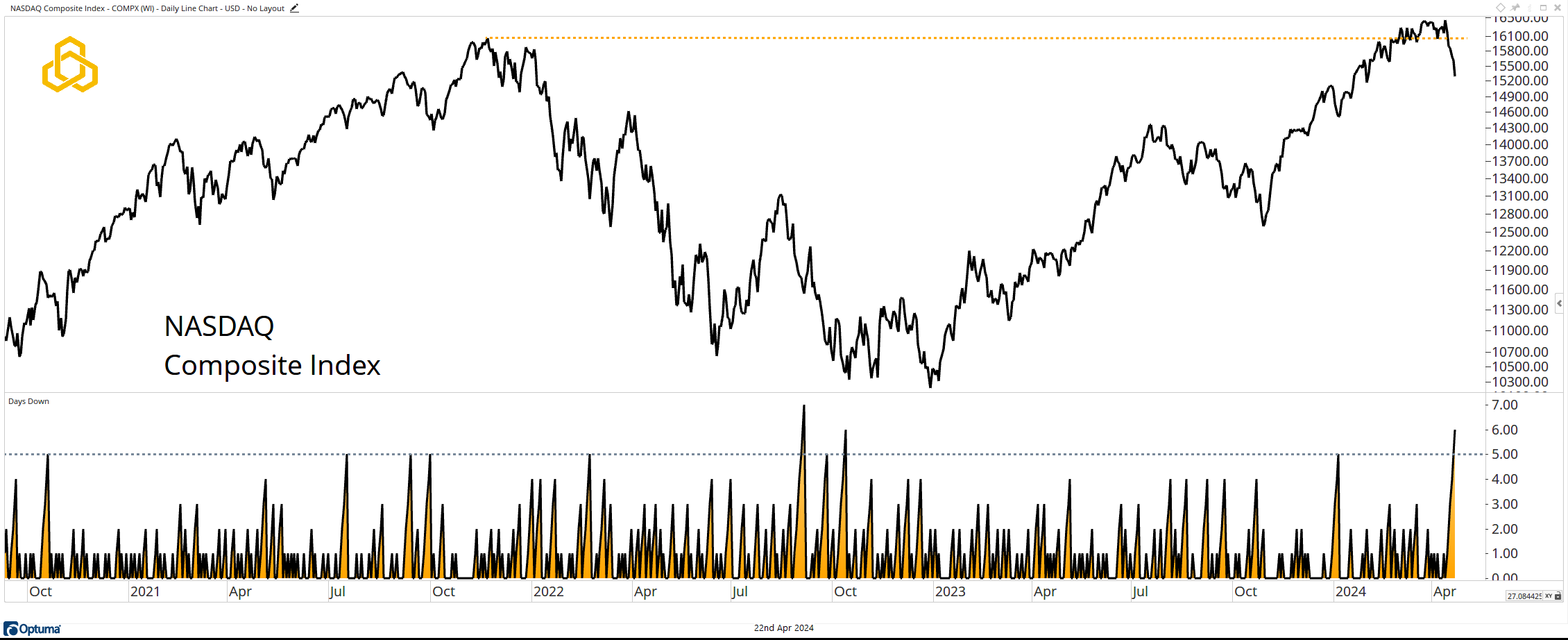 Not one to be outdone by the more high-profile S&P 500 Index, the NASDAQ Composite Index has also registered six losers in a row for the first time in 18 months. More ominous is the fact that the move comes on the heels of setting a record high above the 2021 peaks. Until the highs are regained, the benefit of the doubt sits with the bears.