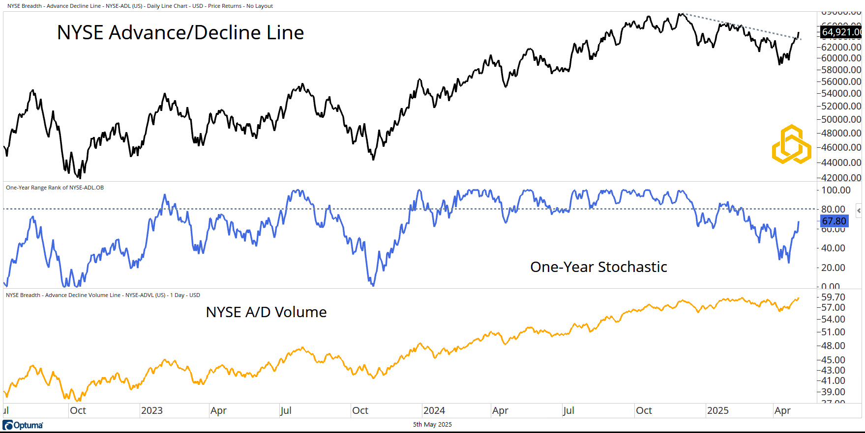 Breadth is improving—even the most perma of permabears would have to admit as much. The Advance/Decline Line on the NYSE has broken the downtrend from the November 2024 peak, while the one-year stochastic has given us an impressive rebound.