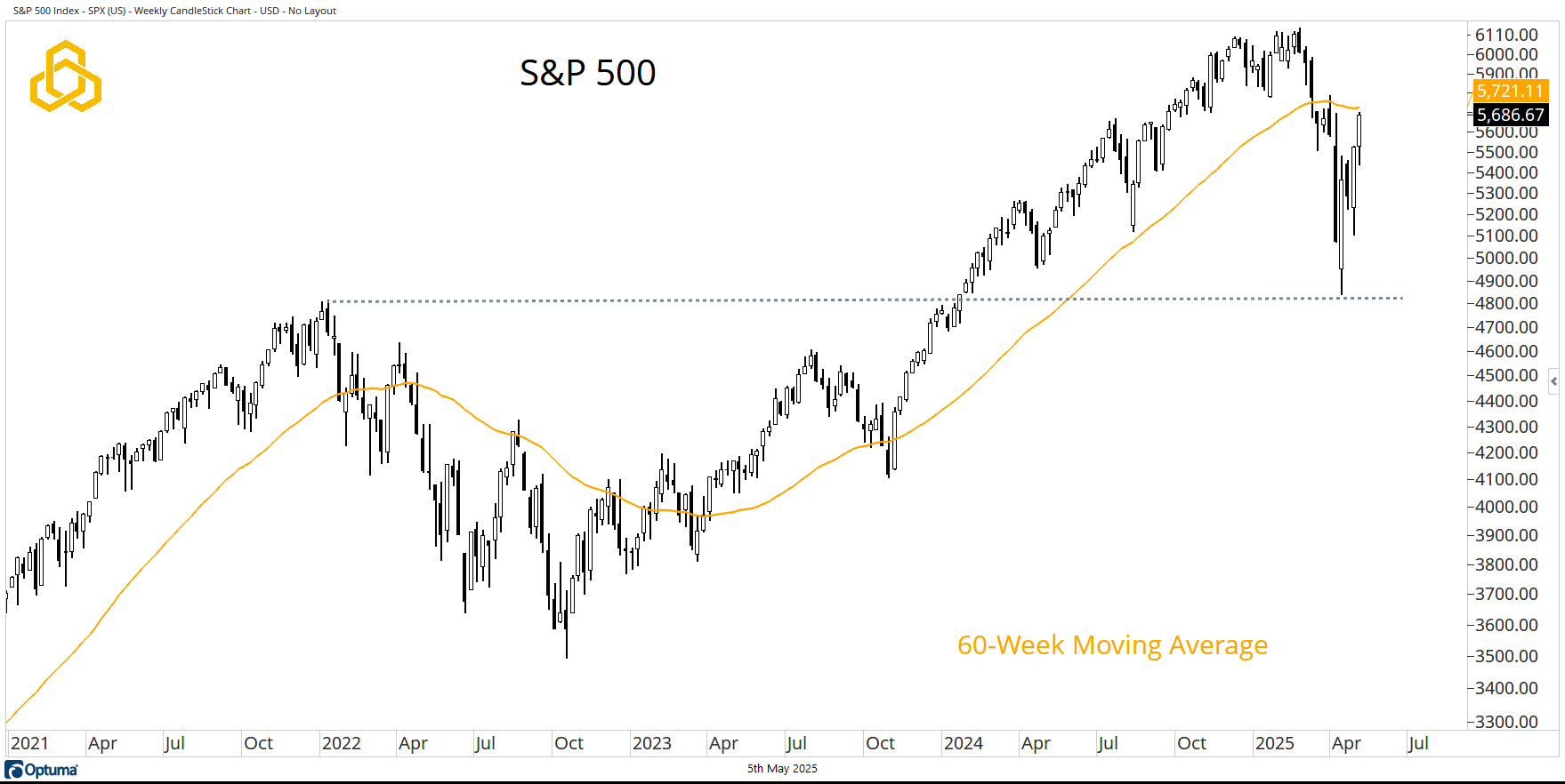 For the second consecutive week, the major averages in the U.S. reversed losses to close near the top of the range. In the case of the S&P 500 and the NASDAQ 100, those rallies have brought the indices to their respective 60-week moving averages. This is a logical spot for the bulls and the bears to have a “little dance.”