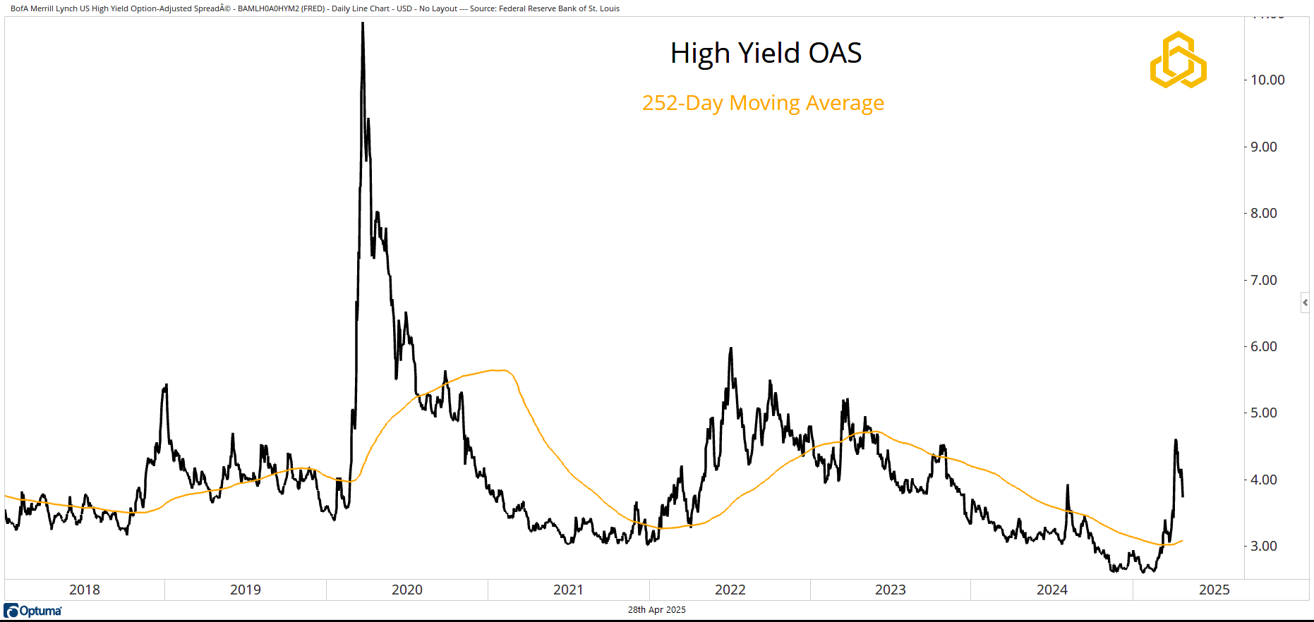 Finally, we are beginning to see improvements in high yield credit. The High Yield OAS (Option-Adjusted Spread) has moved lower over the past three weeks. Yes, it remains above the 252-day moving average (remember, not all lights are green yet), but the narrowing of spreads is a welcome sign for equity bulls. Improvements in the high yield market tend to correlate with stronger stock prices.