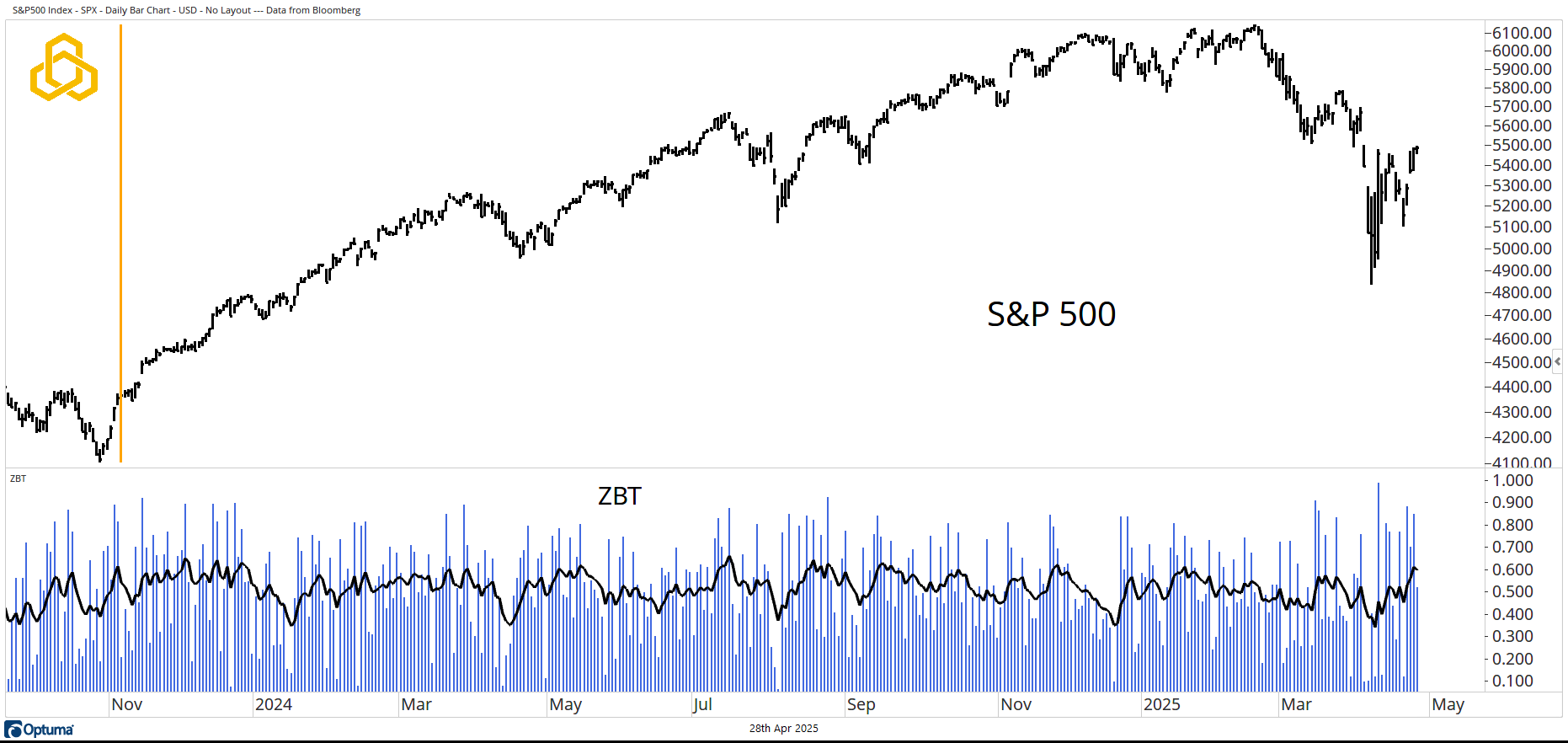 The moving average was below 0.40 on April 10th and crossed above 0.615 on Thursday, generating the ZBT signal. The gold vertical line on the chart highlights the last signal, which occurred in November 2023. The ZBT has had bullish intermediate-term implications in the past.