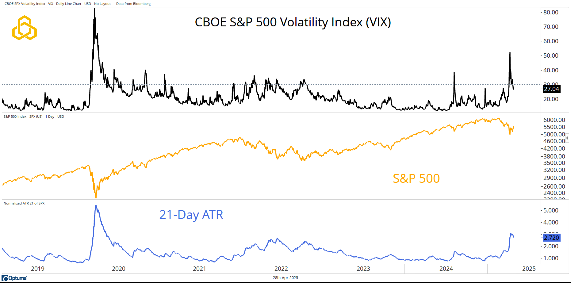 Last week, we saw the VIX move below 30, closing at 27.04, signaling that investors expect the S&P 500 to move approximately 1.69% per day over the next month. Meanwhile, the 21-day ATR has moved lower to 2.72%. The market is now pricing calmer waters for stocks than what recent history has delivered. That is a step in the right direction.