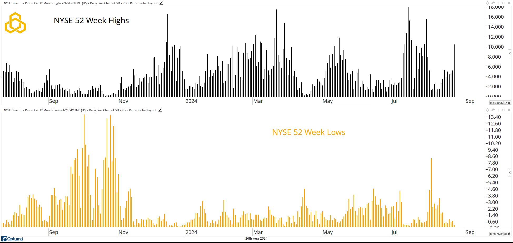 We continue to see more new highs than new lows on the New York Stock Exchange. One would imagine that a hard landing would involve a decline in equity prices. It is hard to have a sustained decline without a lasting increase in new lows / decrease in new highs.