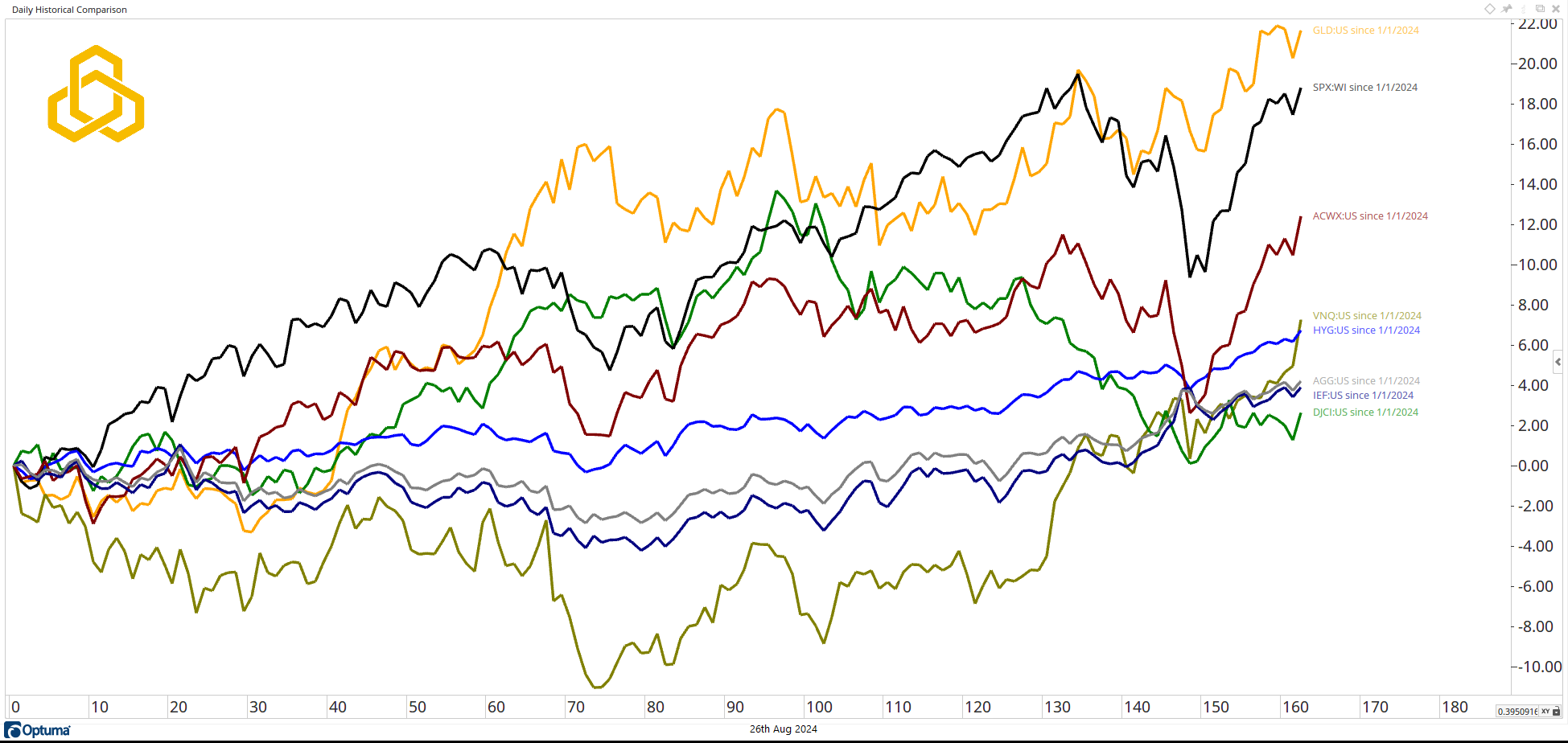 Looking across major asset classes (Gold, U.S. Stocks, International Stocks, Real Estate, High Yield Bonds, Investment Grade Bonds, Treasuries, and Commodities), we can see that all are positive year-to date.