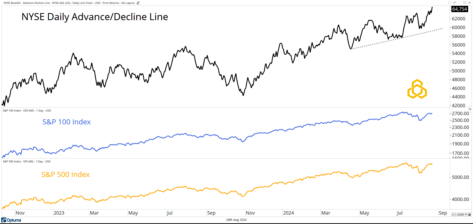 Long-time readers of our work know that the Advance/Decline Line is an indicator that we follow closely. It has reached new highs AHEAD of the S&P 500 and the S&P 100, increasing the odds that those two indices will follow suit.