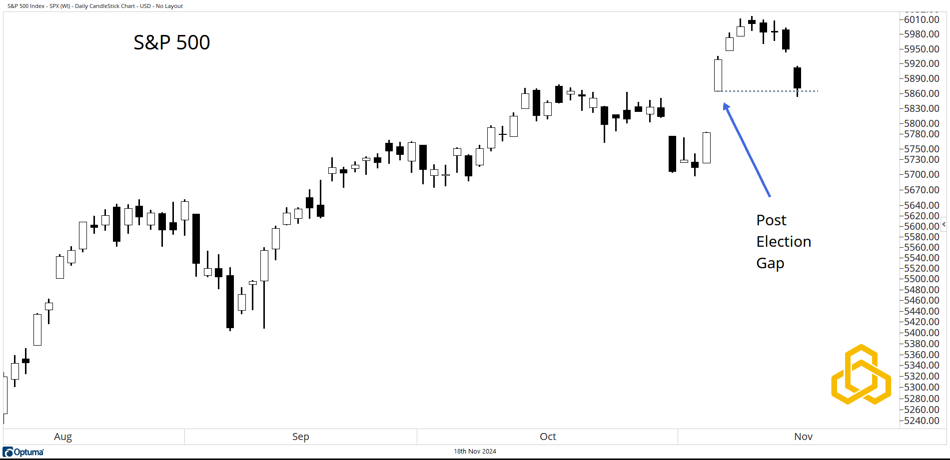 While we normally focus on the weekly time frame here, today we want to highlight the daily. The S&P 500 ticked a new all-time high on Monday, then spent the rest of the week moving lower. After five consecutive days of closes below their opens (black candles), the index has moved back to the post-election opening level.