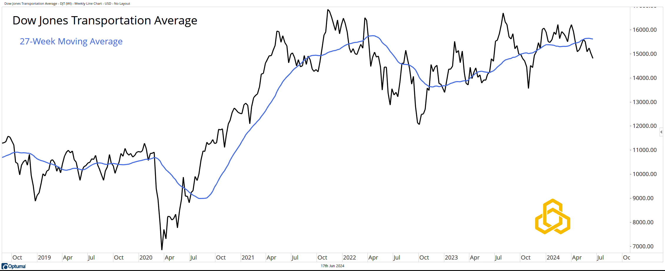 The Dow Transports have been in a well-documented consolidation since peaking November 2021. However, the index has deteriorated over the past few weeks, pushing below the 27-week moving average, which is now lowering as well - warning sign #2.