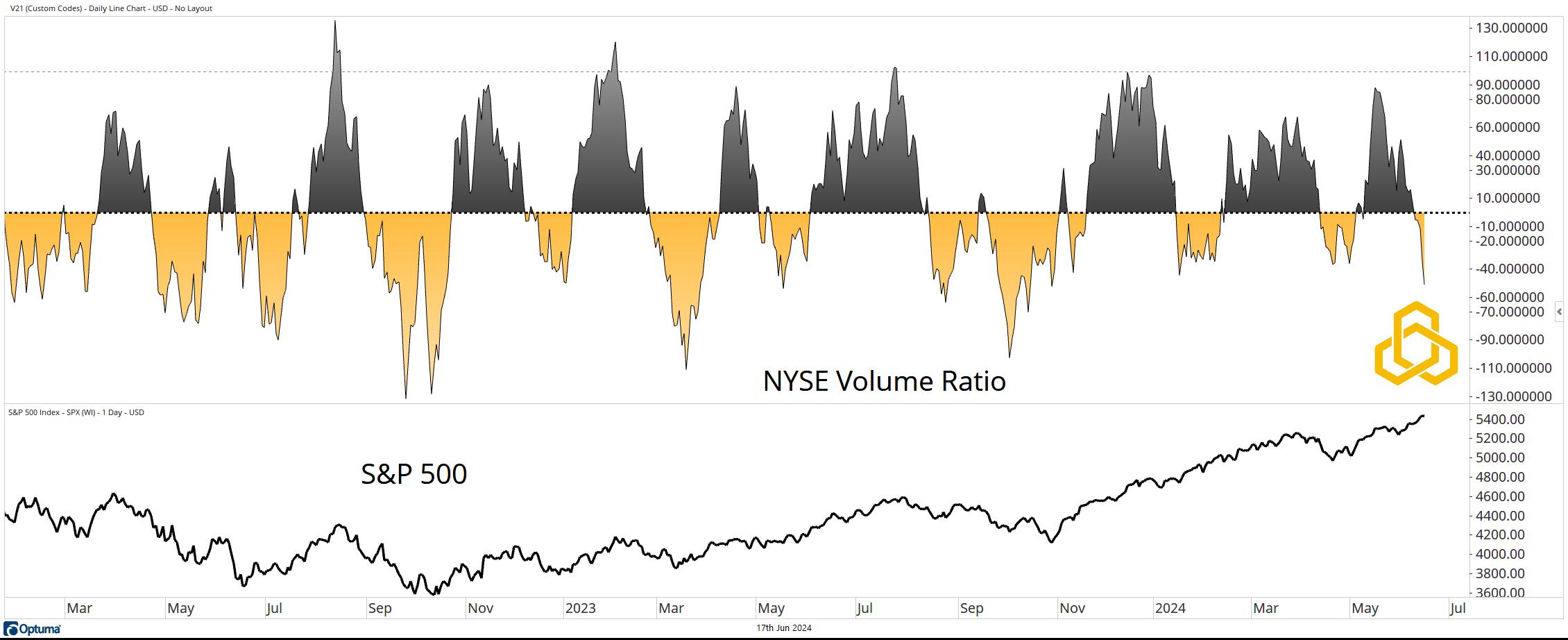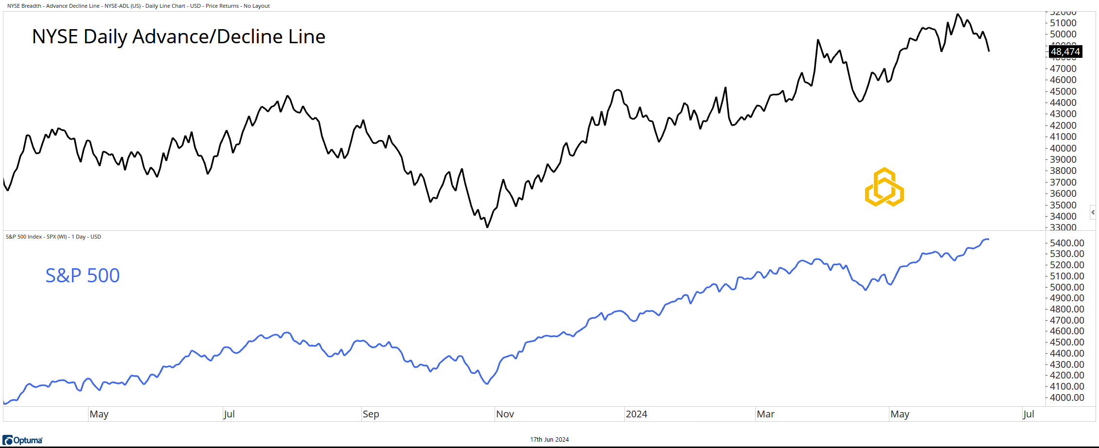In strong bull markets, we expect to see more stocks going up than down, which would tell us that the trend is healthy. Since May 30th, as the S&P 500 grinds to new highs, the NYSE Advance/Decline Line has been moving lower - warning sign #3.