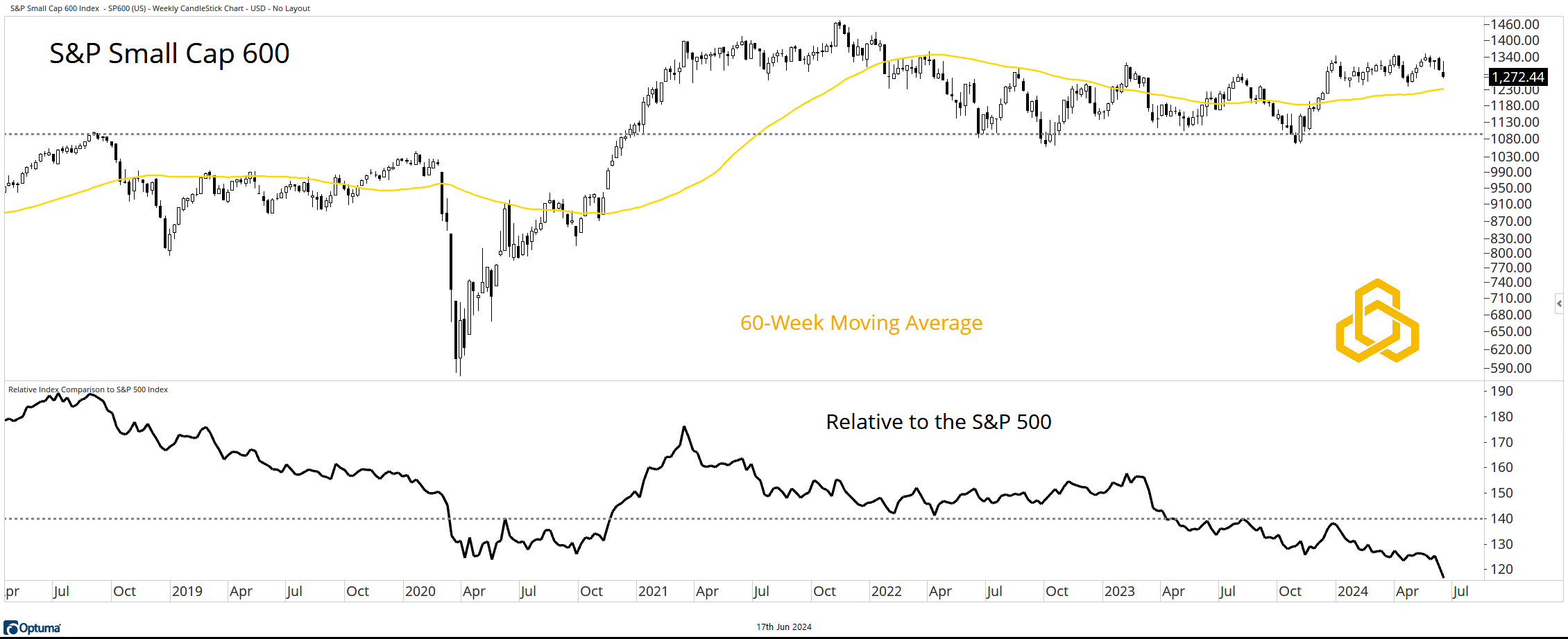 The S&P 600 Index of small-cap stocks paints a less bullish picture of the market environment. The index did not close at an all-time high last week. In fact, it has not seen all-time highs in over two and a half years. Sure, it trades above the 60-week moving average, but that measure of trend is lower than it was two years ago - warning sign #1.