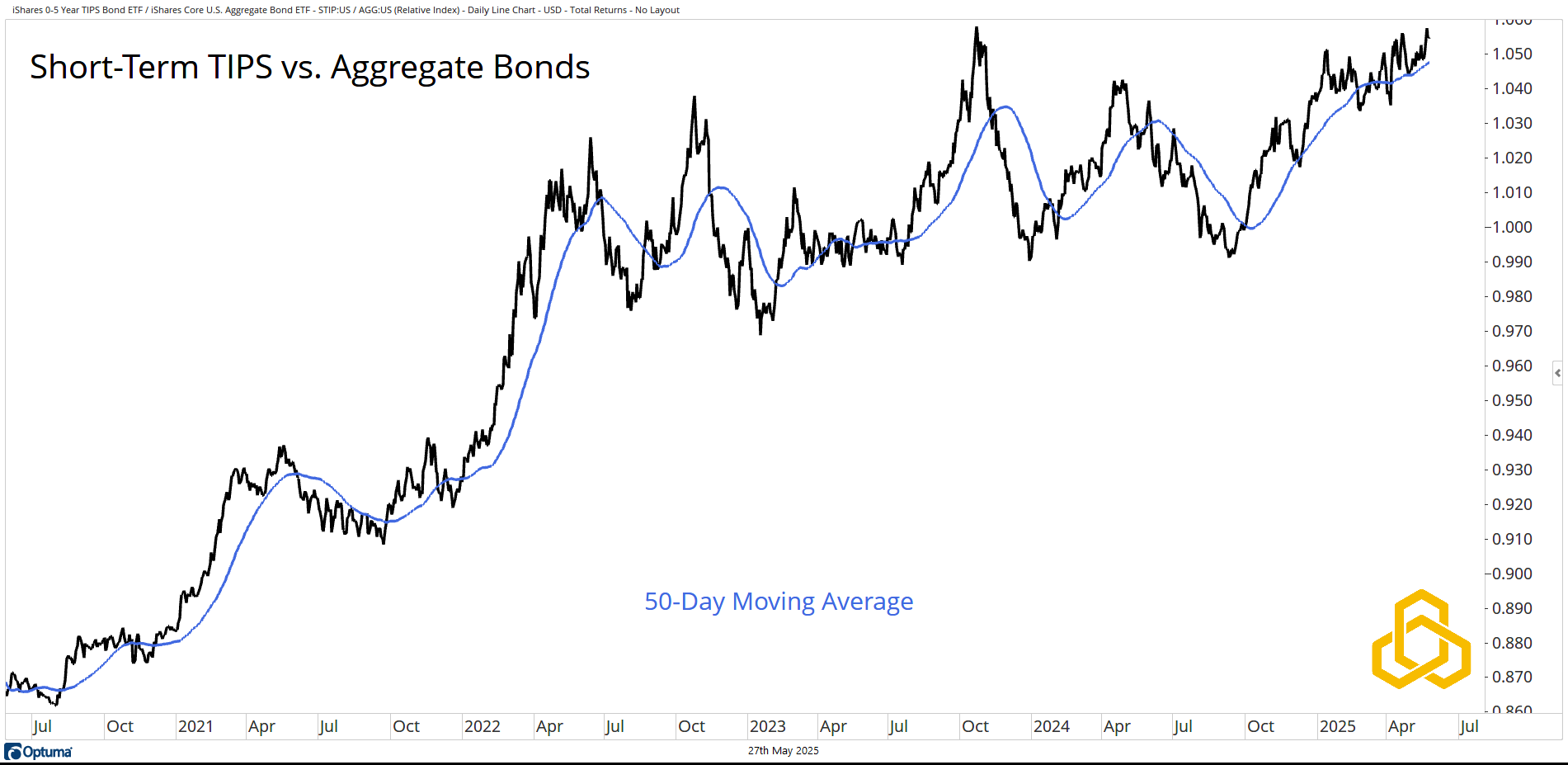 This is a long way of saying the market may be anticipating higher inflation. Look no further than short-term TIPS versus aggregate bonds—trading near record highs and above a rising 50-day moving average—for confirmation.