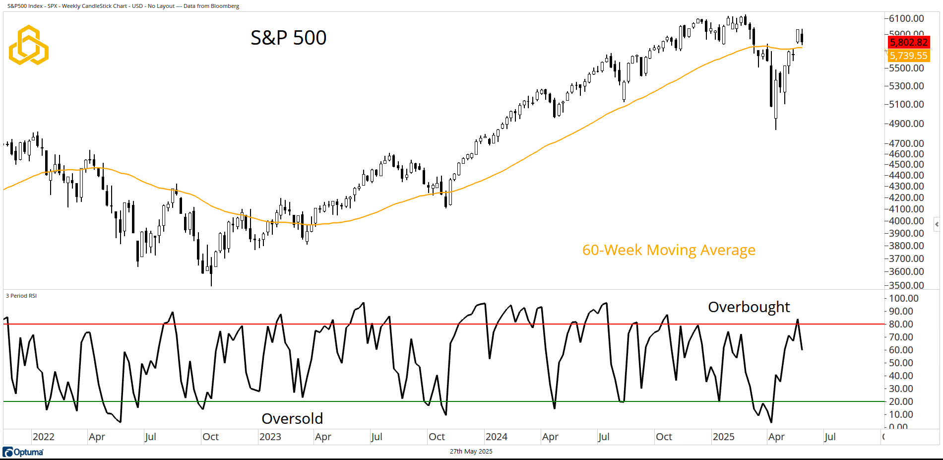 “Given the U.S. credit rating cut, it’s logical to expect some near-term weakness. However, as long as the index remains above the 60-week moving average, the odds favor a run to new highs.”