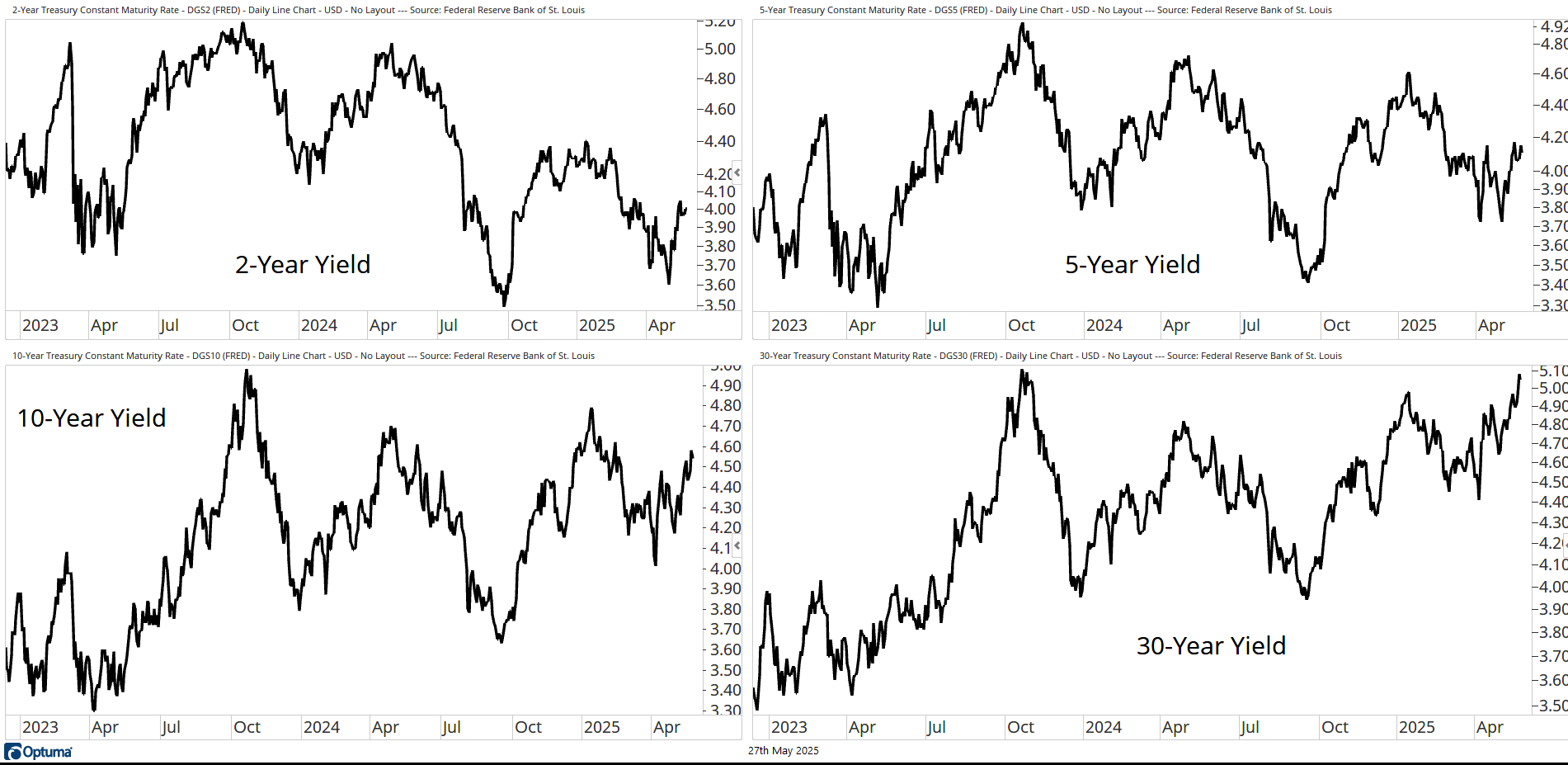 If I were to put on my discretionary hat and look for trouble spots in the market, I’d point to rates. From the two-year to the 30-year, Treasury yields have been moving higher across the board.